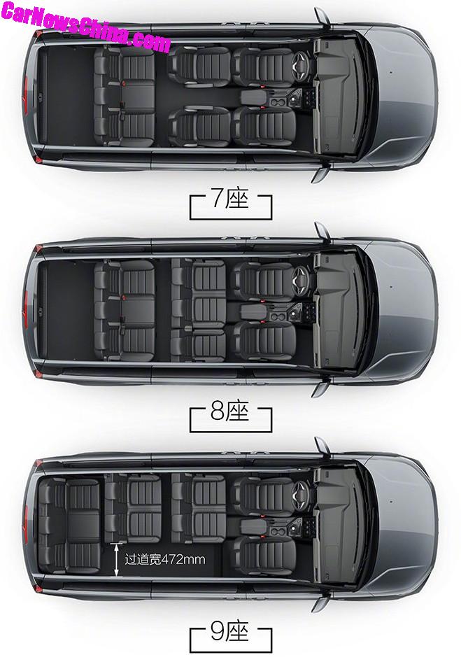 Длина минивэна достигает 5150 мм при колесной базе в 3180 мм. Ширина и высота составляют 1840 и 1895 мм соответственно. Для модели предложены три конфигурации на 7, 8 и 9 посадочных мест. Объем багажного отделения варьируется от 1737 до 2480 литров. Также предусмотрено 21 отделение для хранения мелочевки по всей кабине.