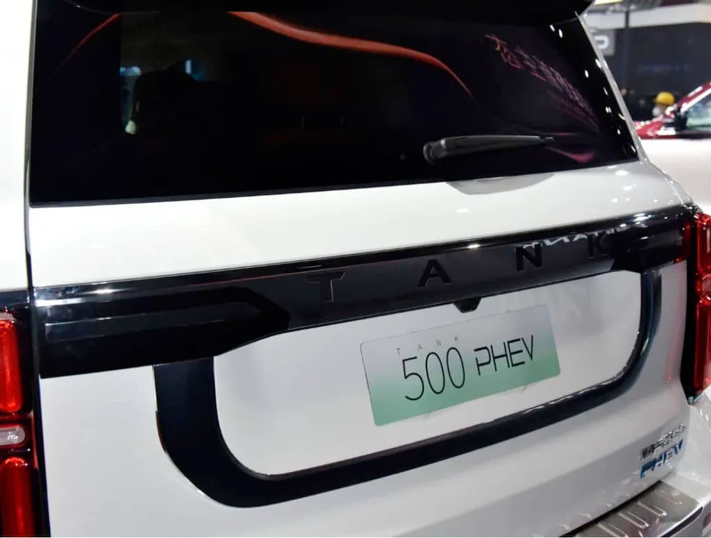 Внешне плагин-гибридный Tank 500 практически не отличается от «топливной» версии, вышедшей на рынок годом ранее. У него такая же шестиугольная хромированная решетка радиатора и узнаваемые светодиодные фары. Вертикальные задние фонари соединены широкой хромированной планкой с надписью «Tank». На наличие гибридной силовой установки под капотом автомобиля указывает только шильдик «PHEV» в правом нижнем углу и лючки на обеих боковинах. С одной стороны — топливного бака, с другой — зарядки тяговой батареи емкостью 19,94 кВтч. От обычной сети батарея пополняется за 3 часа, от скоростного терминала — за 30 минут.