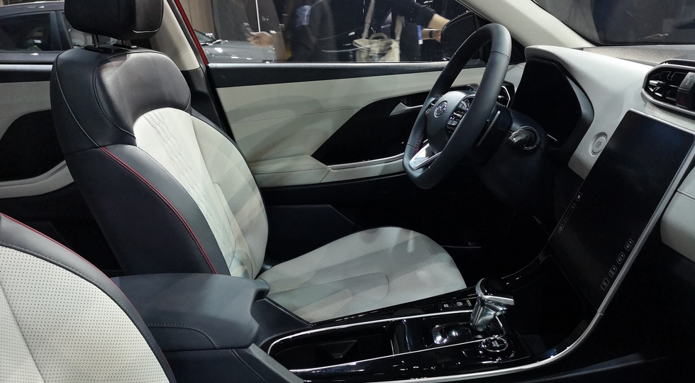 Интерьер удивил еще больше. Посмотрите на огромный экран мультимедийной ситемы. Скорее всего, он имеет вертикальную ориентацию, но мы сомневаемся, что изображение транслируется на всю высоту панели. Вероятно, часть рабочей поверхности отдали под сенсорные органы управления, расположенные под экраном.