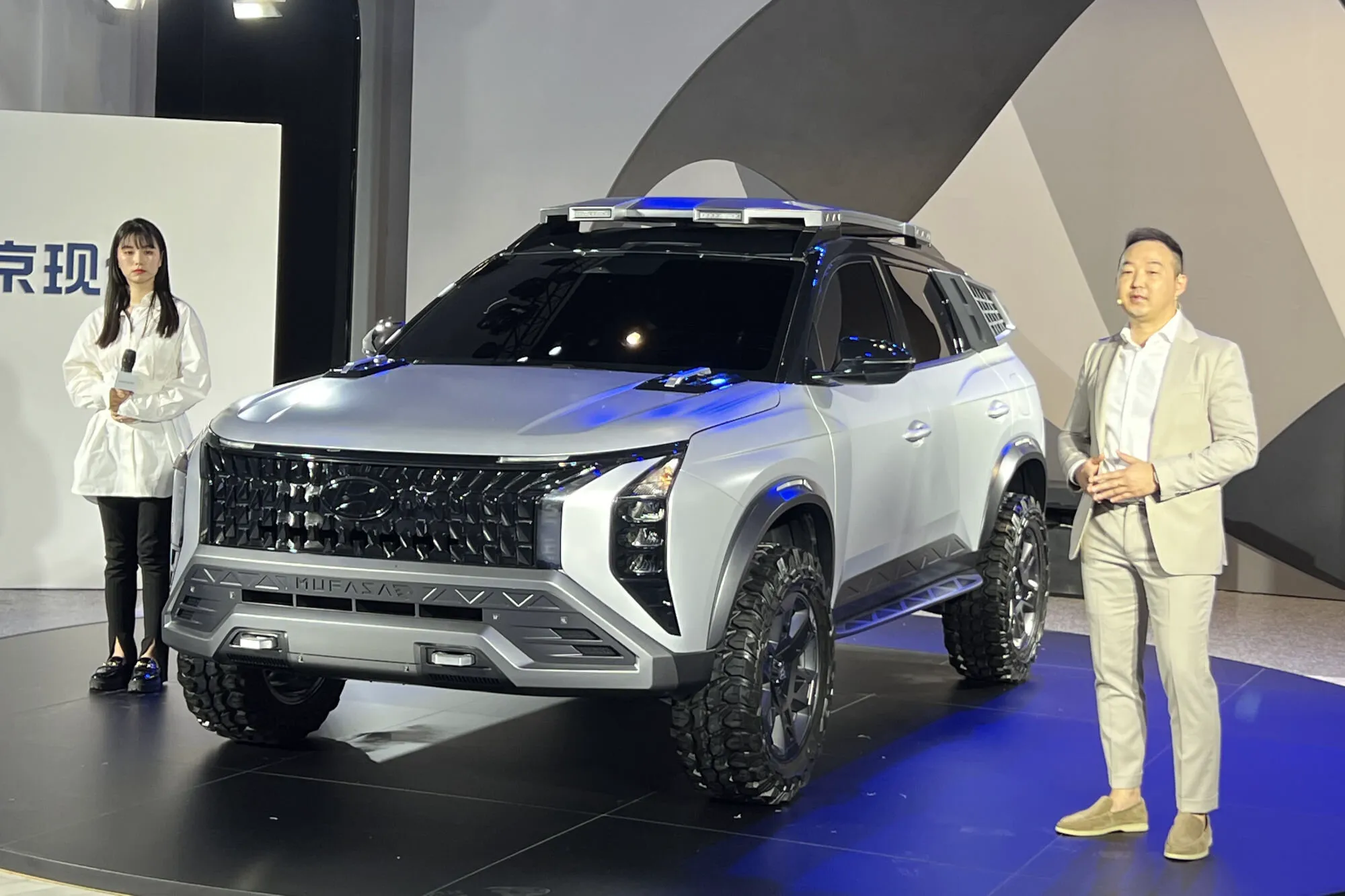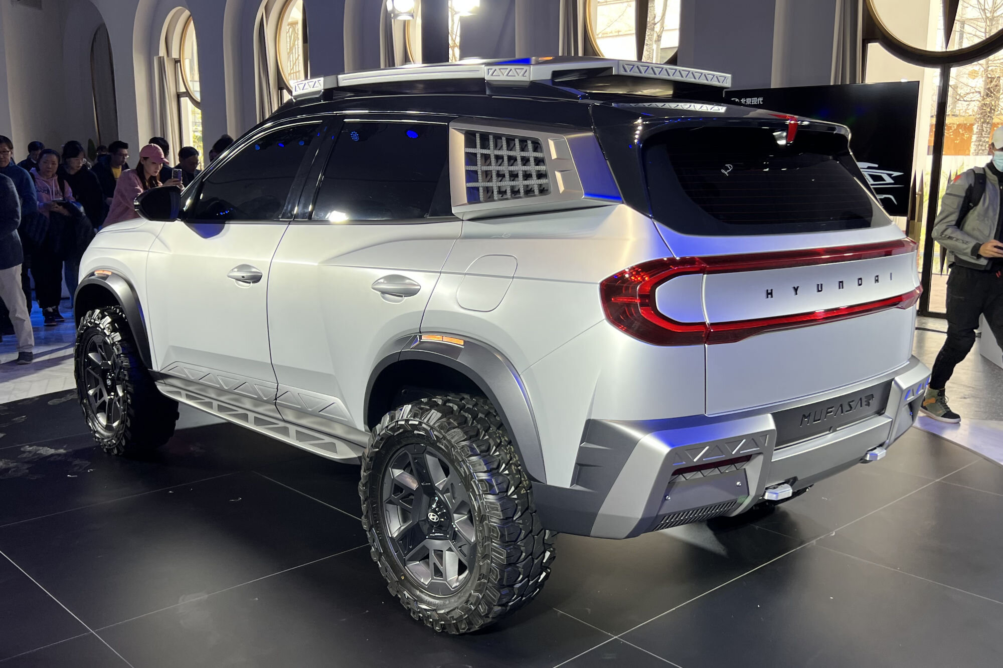 У брутального шоу-кара массивные бамперы с буксировочными проушинами, поручни на крышке капота, дополнительные подножки и большие колесные диски с внедорожными шинами. На крыше — туристический багажник с дополнительной люстрой, а на задних стойках — решетки. Если все это отвергнуть, то получим серийный Hyundai Mufasa, фотографии которого китайский сертификационный орган опубликовал в феврале. Интерьер автомобиля так и остался за кадром.