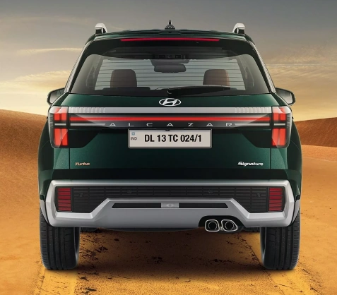 Модель стала более брутальной на вид, получив угловатый кузов с широкой решеткой радиатора и новой массивной защитной пластиной, охватывающей бамперы. Фары теперь двухъярусные и получили новую графику, а задние фонари объединены в единый блок. В передней части Alcazar есть тонкая светодиодная полоса, а на крыше установлены современные рейлинги. Ездит кроссовер на 18-дюймовых легкосплавных дисках с алмазной огранкой.