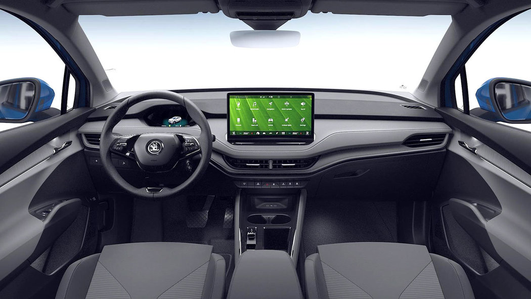 В первую очередь от других модификаций такой кроссовер Шкода отличается упрощенной отделкой снаружи. Производитель отказался от хромированных украшательств, а заглушка на месте передней решетки не светится. Напомним, в дорогих исполнениях на этой панели может быть горизонтальная светодиодная полоска и подсвеченные вертикальные ламели. Еще стартовый электрокар бывает только синим. За другие цвета придется доплатить.