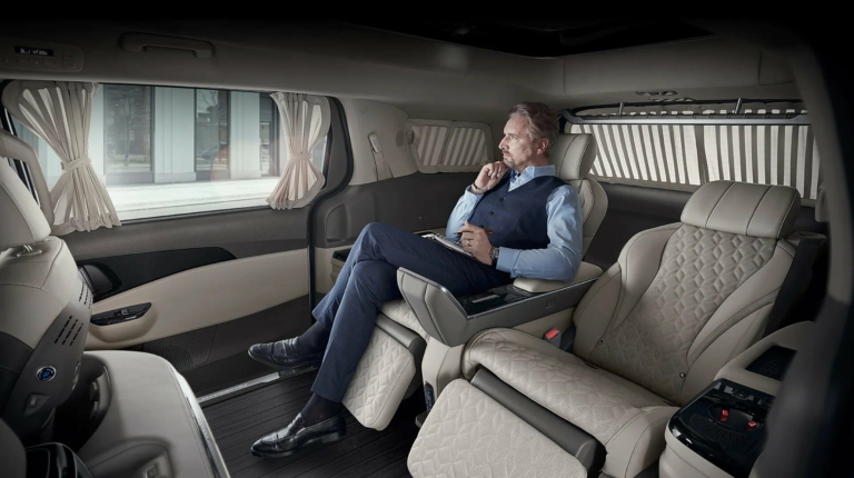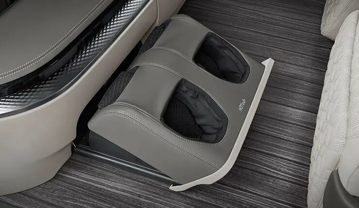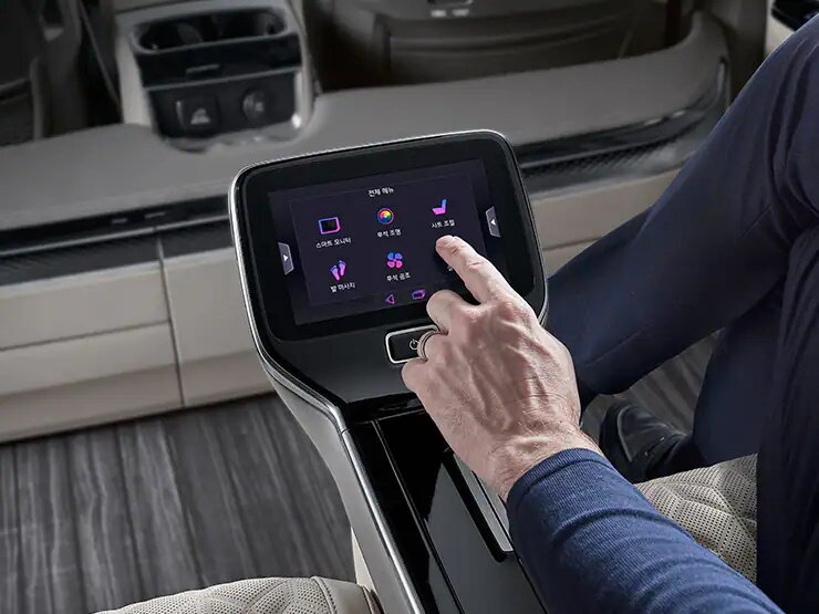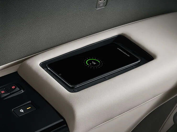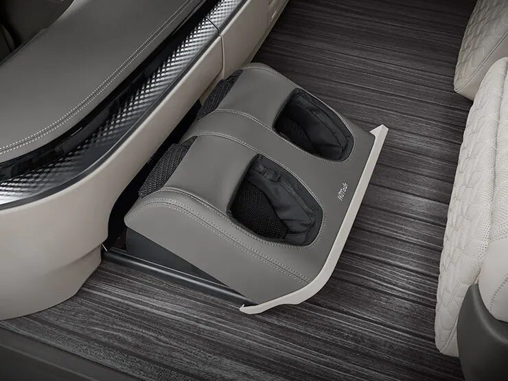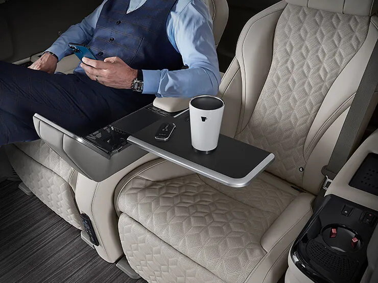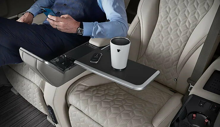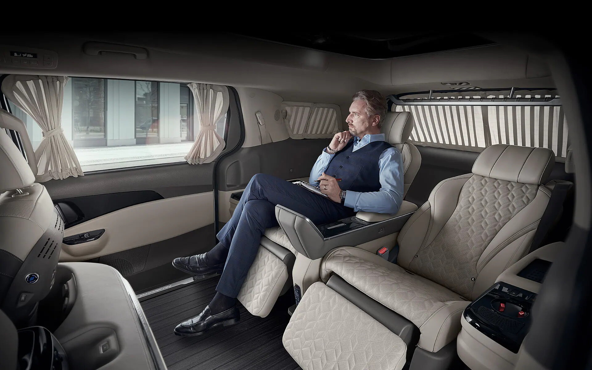В заднем ряду – два отдельных кресла в обивке из кожи Nappa и с функцией массажа (в том числе внутри подставок для ступней). В потолок встроена светодиодная подсветка и 21,5-дюймовый дисплей. Стандартно вэн укомплектован очистителем воздуха, есть отсеки для холодных и горячих напитков. Также в распоряжении пассажиров беспроводная зарядка для смартфонов и семидюймовый сенсорный дисплей, на который вынесено управление различными функциями.