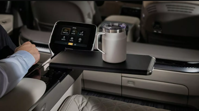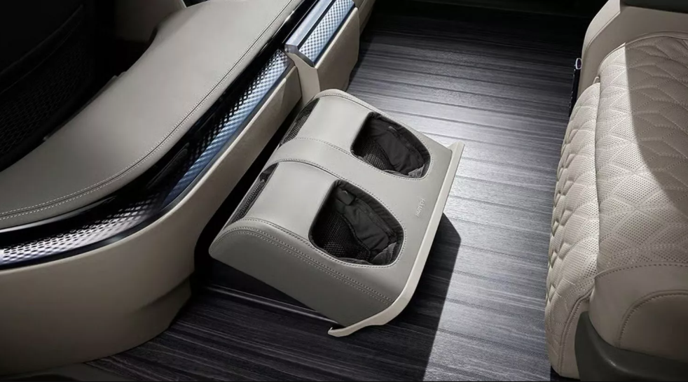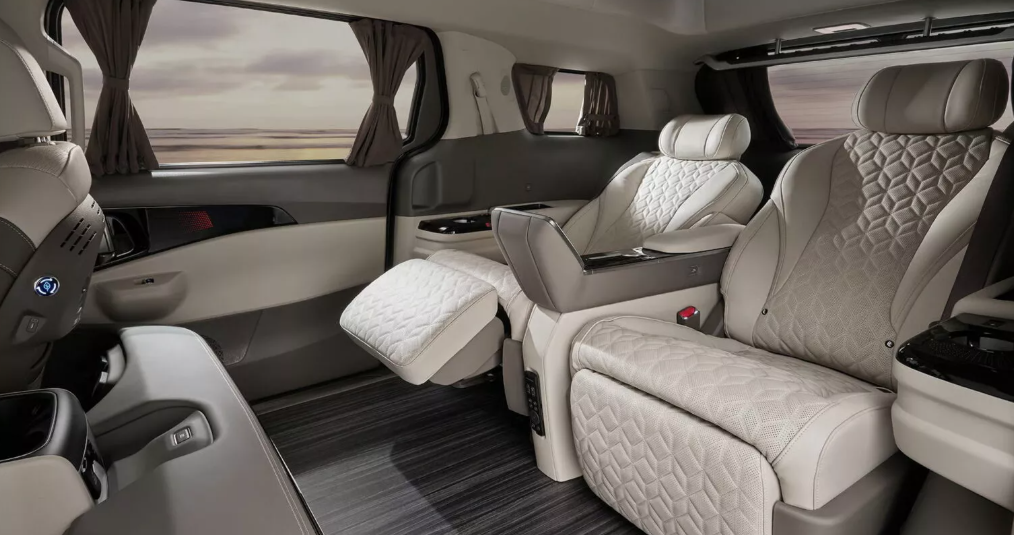 Во флагманском варианте во втором ряду установлены капитанские кресла с выдвижными подставками для ног, функцией массажа, откидывающимися спинками, отсеком для хранения обуви. Еще в оснащение входит 21,5-дюймовый монитор, 7-дюймовый сенсорный контроллер, установленный на центральной консоли, слот для беспроводной зарядки смартфона и аудиосистема Bose с 12 динамиками, а также холодильник, складные столики и вешалки для одежды.