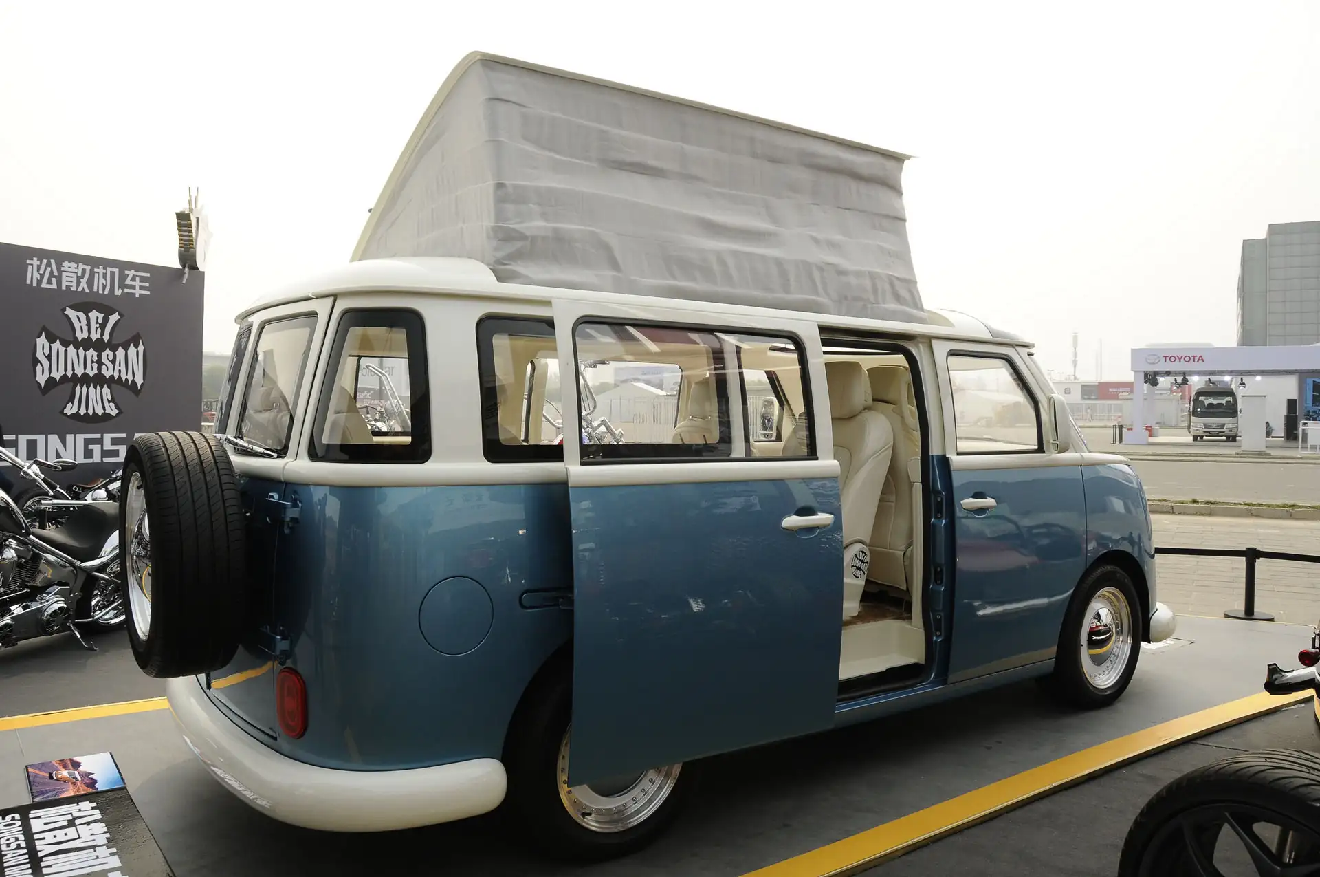 Однако новинка получила и некоторые современные атрибуты, которые отличают ее от известной модели. В частности, китайский MPV оснастили комплектом раздвижных дверей, люком на крыше и запаской на корме. Главной особенностью нового минивэна стала откидная крыша, которая образовывает специальный навес, позволяющий пассажирам разместиться в салоне в полный рост и наблюдать окрестности через люк на крыше.