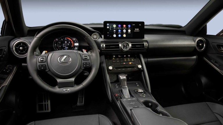 Салон IS 500 F Performance оформлен идентично обычному седану с пакетом F Sport. Из отличий только иная графика приборной панели и декор. Кроме того, уже «в базе» седан может похвастаться рулевым колесом с подогревом, алюминиевыми накладками на педалях, 10,3-дюймовой мультимедийной системой и наличием комплекса безопасности Lexus Safety System+.
