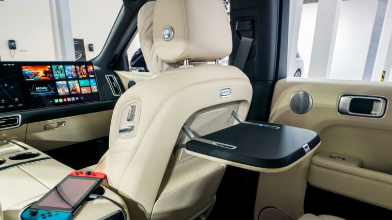 В переднем и заднем ряду установлены капитанские сиденья с высокими подголовниками, подогревом, вентиляцией и массажем. Для задних пассажиров предусмотрен «бонус» в виде регулируемых подставок для ног. Но самое интересное — это девайс, способный работать как холодильником, так и сохранять еду горячей.