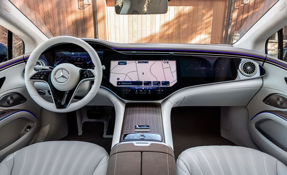 Особый Mercedes-Benz EQS доступен в двух цветах: Manufaktur Diamond White или Twilight Blue. В первом случае интерьер отделан кожей цвета Macchiato Beige и Space Grey, во втором — Neva Grey и Sable Brown. Декор — ореховое дерево.