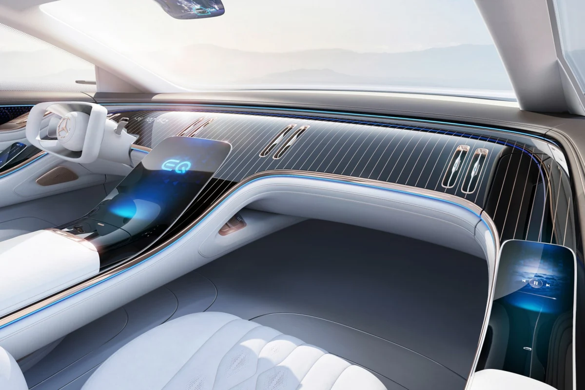 Внутри Mercedes EQS вдохновлён яхтами. По всей ширине автомобиля проходит огромная дуга, а наклонная облицовка приборной панели ничем не отличается от скоростных катеров. Повсюду видна отделка из розового золота. Главный же элемент передней панели - большой сенсорный экран портретной ориентации.
