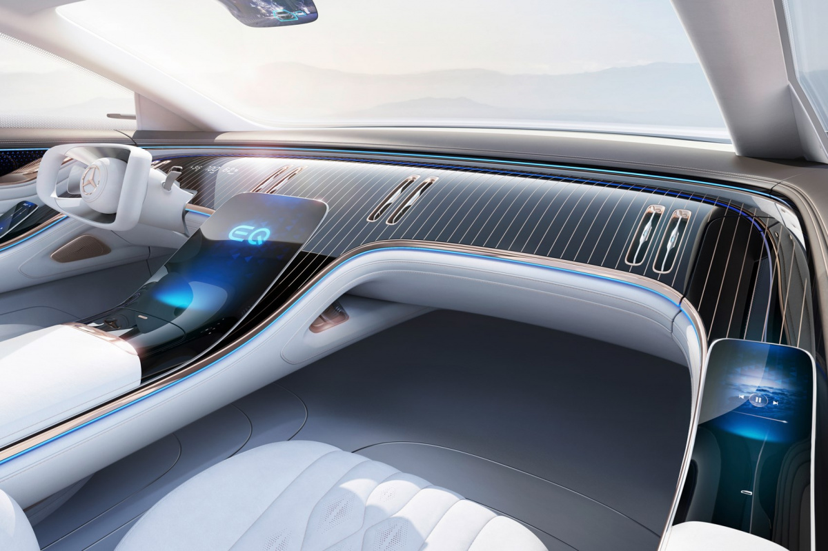 Внутри Mercedes EQS вдохновлён яхтами. По всей ширине автомобиля проходит огромная дуга, а наклонная облицовка приборной панели ничем не отличается от скоростных катеров. Повсюду видна отделка из розового золота. Главный же элемент передней панели – большой сенсорный экран портретной ориентации.