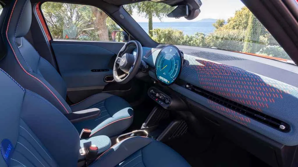 Несмотря на относительно компактные размеры, салон кроссовера довольно просторный. Дизайнеры Mini следовали своему принципу «умное использование пространства», поэтому кроссовер может похвастаться пятиместной компоновкой и грузовым отсеком на 300 литров. В оснащение кабины Aceman вошел круглый 9,44-дюймовый сенсорный OLED-экран, установленный в центре передней панели.