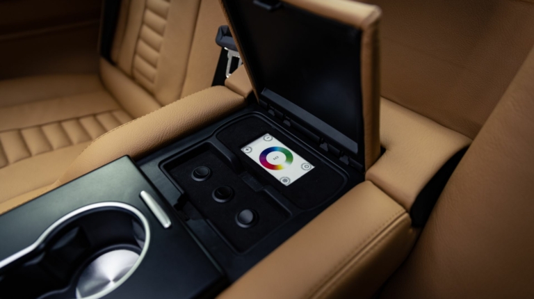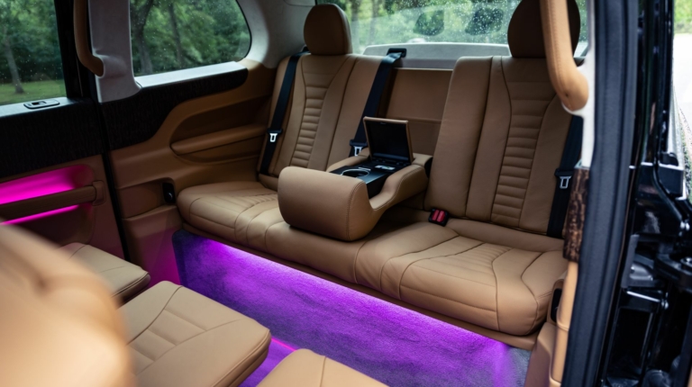 Автомобиль получил панорамную крышу, стереосистему с возможностью подключения Bluetooth, ТВ-тюнер с Apple TV, игровую консоль Sony PS4 и даже небольшой холодильник. Для дополнительного удобства пассажиров задний ряд сидений расположили под углом, а между креслами установили подлокотник с подстаканниками. Отделка выполнена из высококлассной кожи и алькантары, которая дополнена элементами из сандалового дерева.