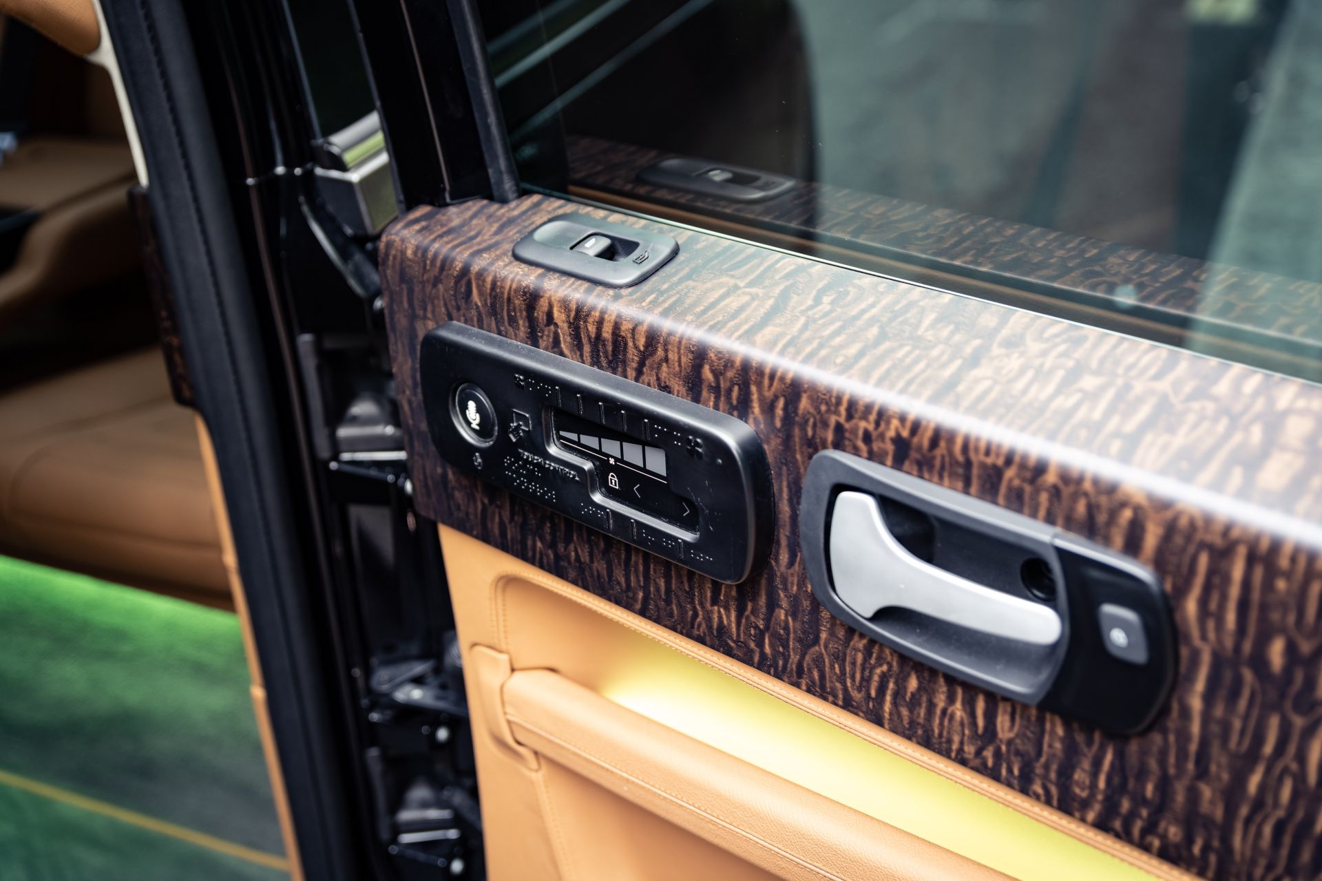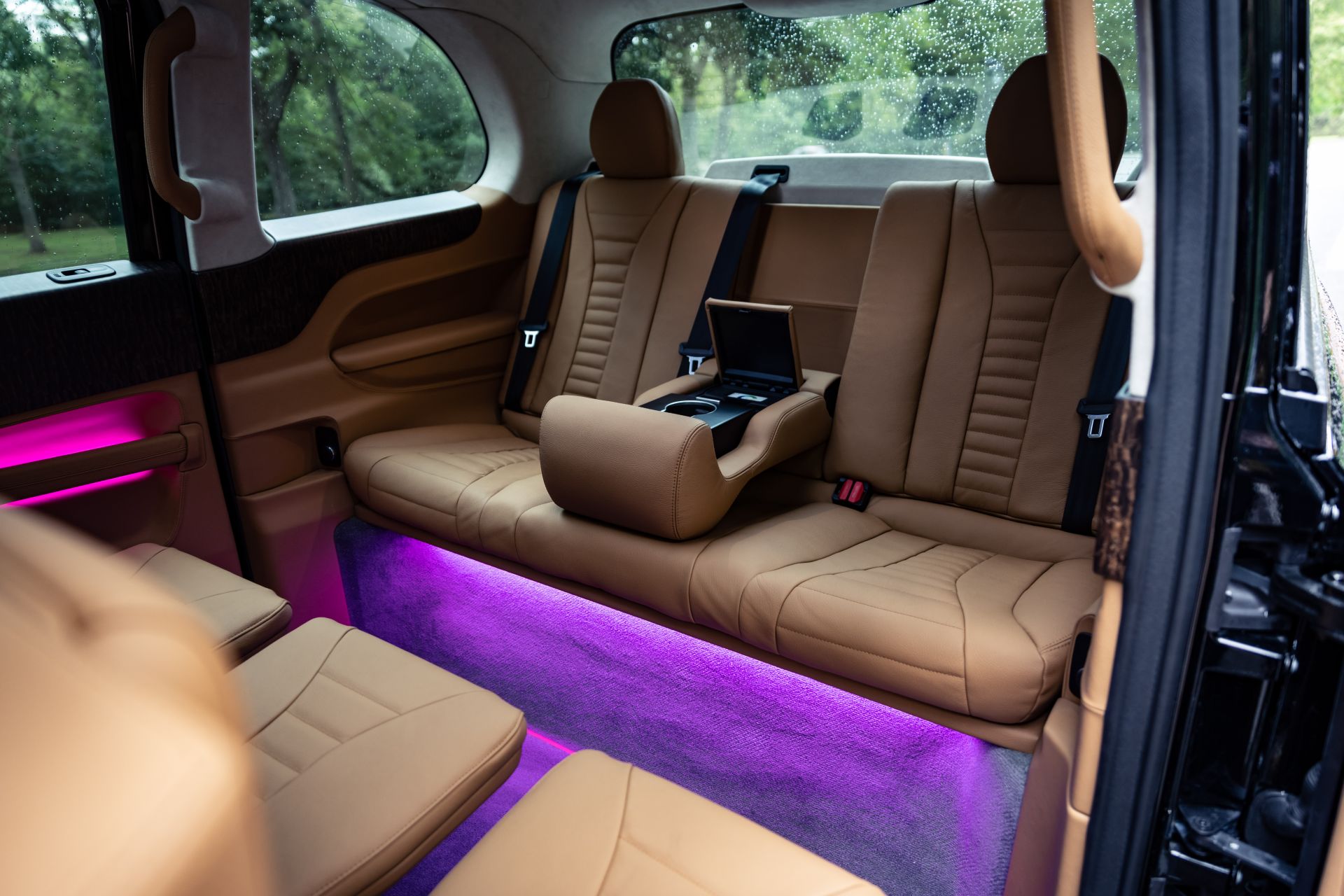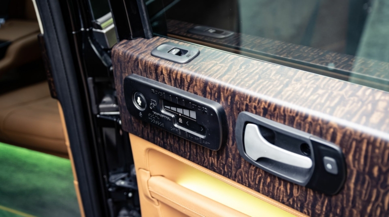 На полу кэба уложен ковер с толстым ворсом, а дверные карты украшены деревянным шпоном. Также в салоне установили фоновое освещение с разными оттенками, которое сделает поездку еще более атмосферной. Кроме того, заднюю часть салона отделили от зоны водителя специальным экраном, который не только обеспечивает конфиденциальность, а и делает автомобиль более защищенным, что очень актуально во время распространения инфекции.