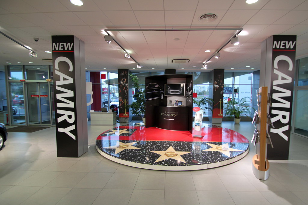 И вот, всего несколько дней отделяют нас от встречи с новой Toyota Camry. Автолюбители с нетерпением считают дни до самой ожидаемой автомобильной премьеры года. В «Тойота Сити Плаза» на Петровке уже все готово ко встрече с новой звездой: подиум, выполненный в стилистике Голливудской аллеи звезд, показывает динамику развития модели Toyota Camry с 1982 по сей день. Информационный стенд с вмонтированным iPad позволяет получить наиболее полную информацию по модели до появления реального авто. Перелистывание информационных страниц на этом стенде напоминает пользование с мультимедийным сенсорным экраном Toyota Touch, которым оборудуется каждая новая Camry.