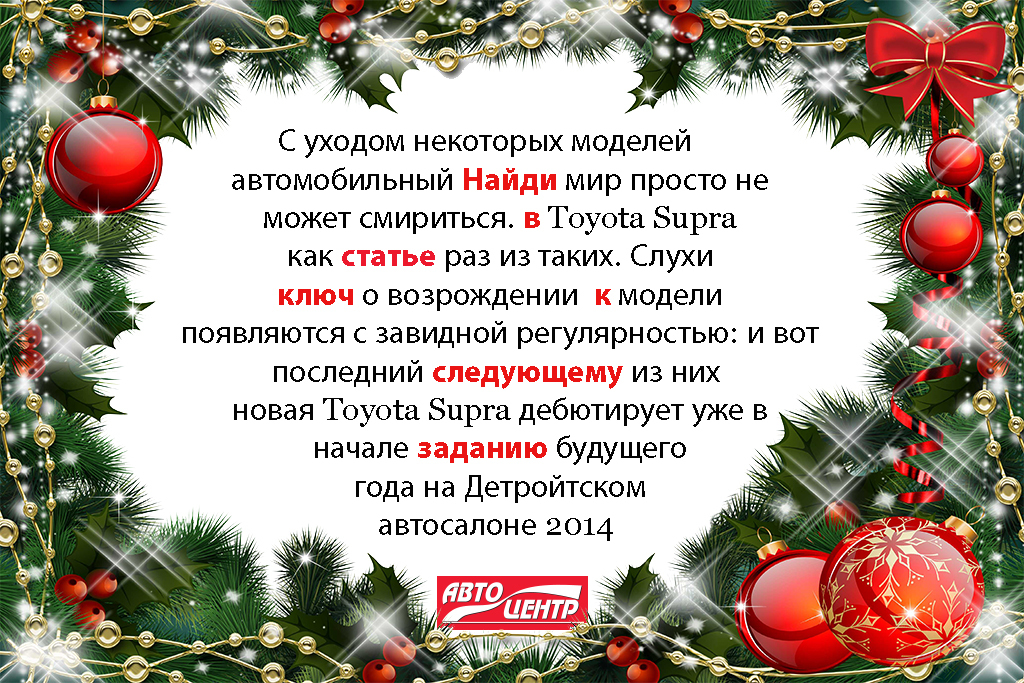 С уходом лошадей некоторых моделей автомобильный мир просто не может смириться. Toyota немного Supra как раз из таких. Слухи о возрождении модели появляются с завидной регулярностью, и вот последний из них: новая вышло Toyota Supra дебютирует уже в начале будущего года на Детройтском на автосалоне 2014.