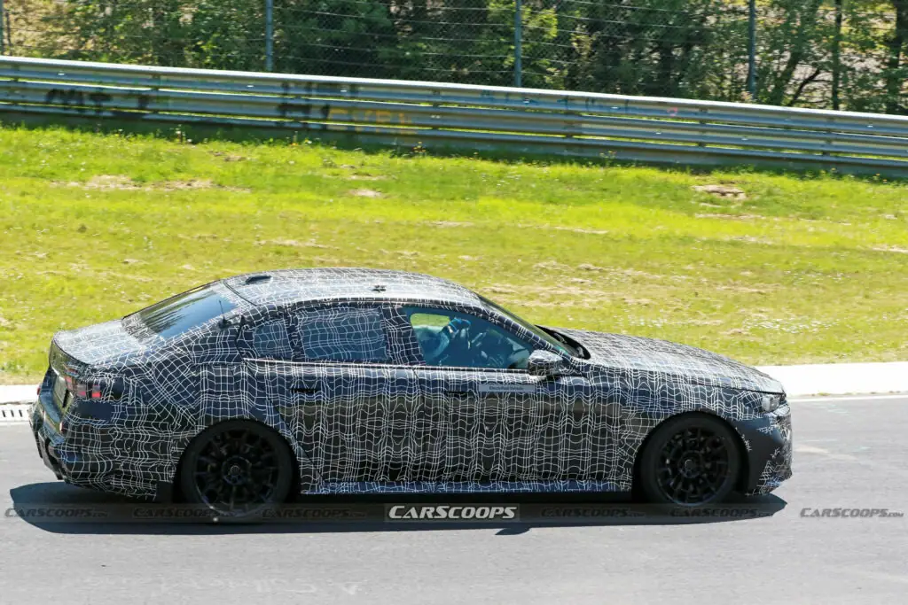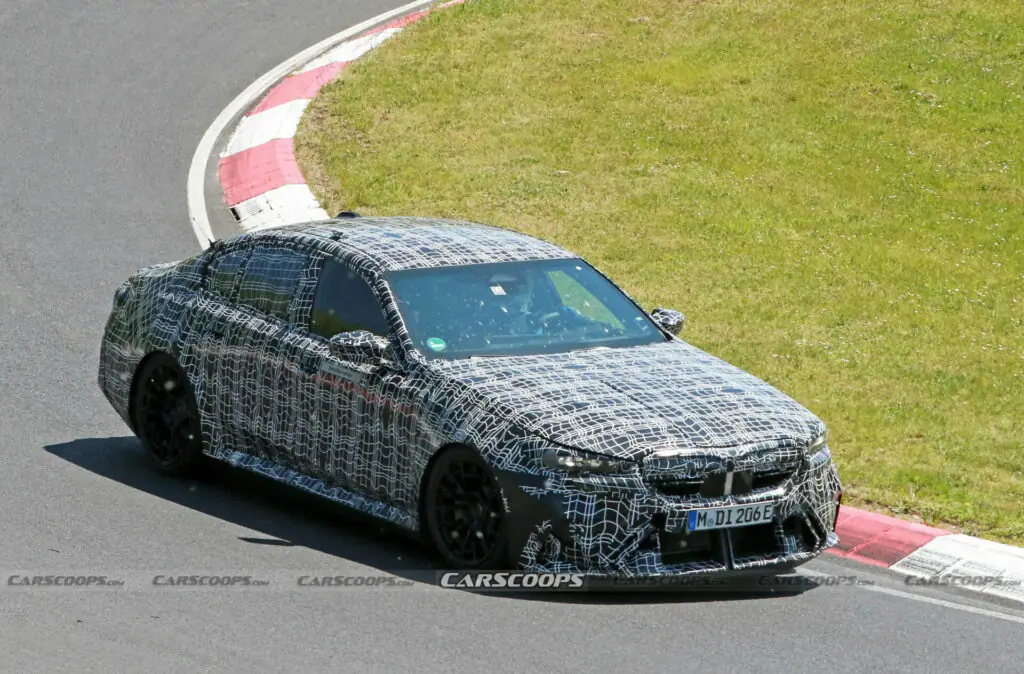 Премьера высокопроизводительной версии BMW 5 Series, дебютировавшей две недели назад, ожидается в 2024 году. Закамуфлированный прототип M5 заметили на Нюрбургринге. Внешне он выглядит довольно агрессивно. Особенно, спорной кажется передняя часть кузова. В частности, большой центральный воздухоборник сложной конструкции. Передние фары заимствованы у базовой «пятерки», тогда как решетка радиатора, по всей вероятности, будет более агрессивной. К ним присоединятся капот с «проваленным центром» и зарядный порт на переднем крыле.