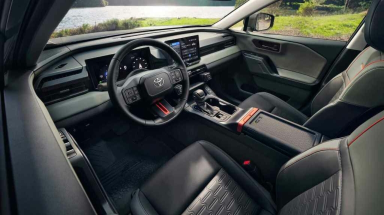 Toyota также предлагает разнообразные материалы отделки салона, включая перфорированную Ultrasuede, ткань и SofTex. В зависимости от комплектации доступны уникальные штрихи, такие как специальный цвет обивки Mineral (для комплектации Woodland), эмблемы Gazoo Racing, алюминиевые педали (для GR Sport) и всепогодные коврики.