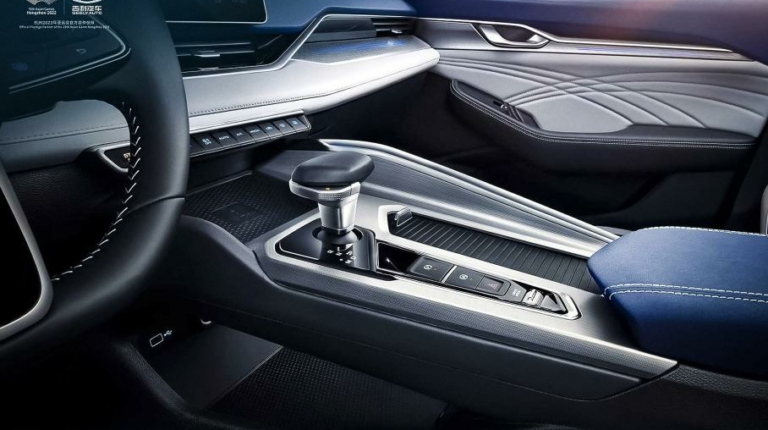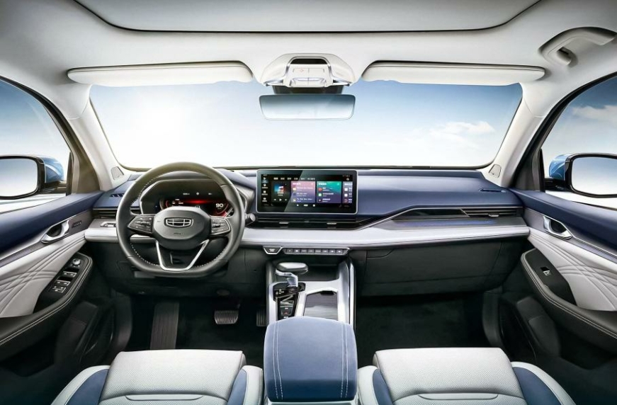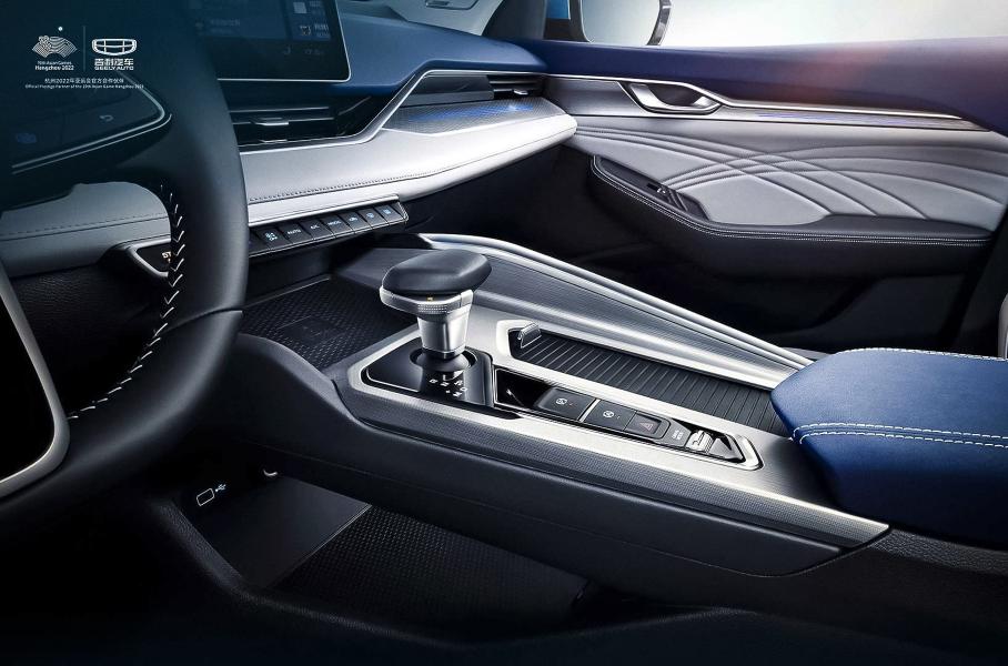 Как видно на фото, интерьер Geely Preface отделан в бело-синей цветовой гамме. При первом взгляде в глаза бросается огромный планшет мультимедиа, расположенный в центральной части передней панели. Под ним красуется ряд физических переключателей (вместе с кнопкой запуска), благодаря которым можно управлять второстепенными функциями.