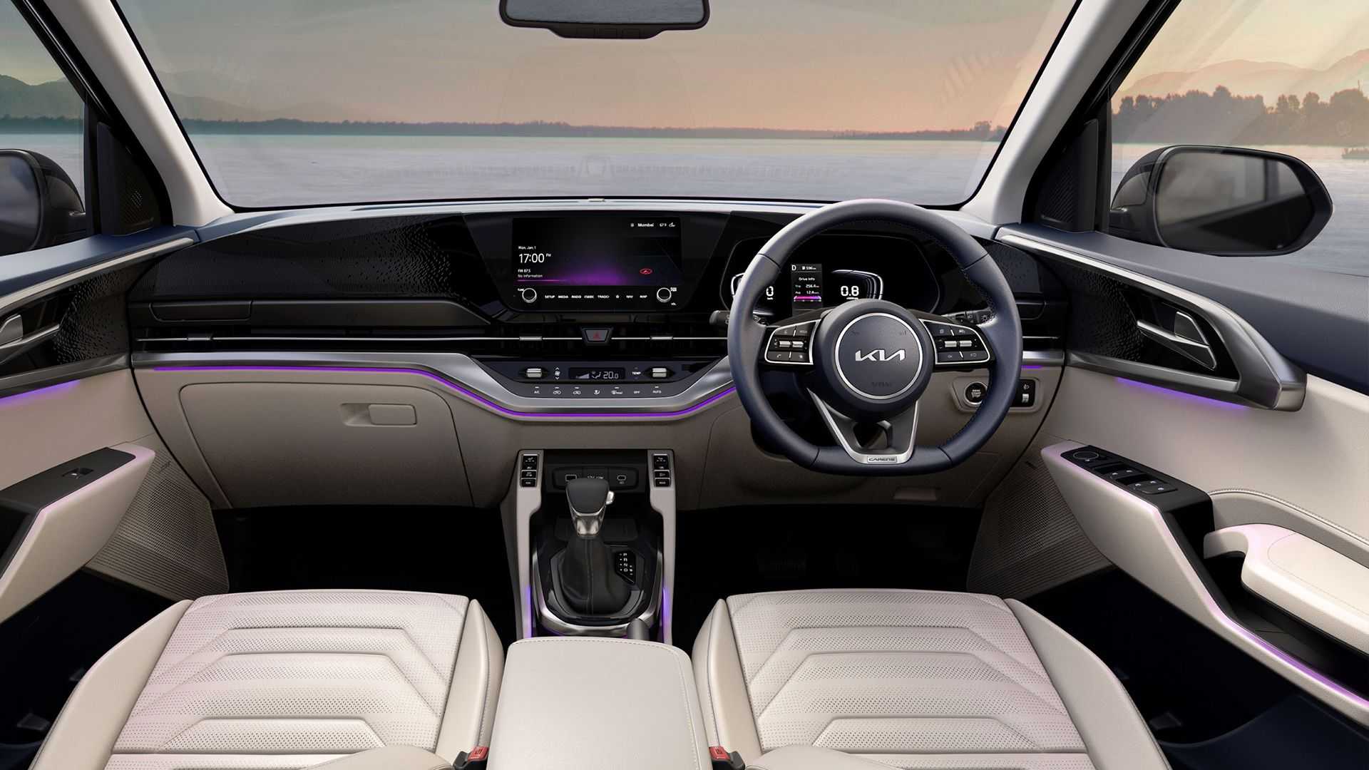 В оснащение салона Kia Carens входит 10,25-дюймовая цифровая приборная панель, мультимедийная система с аналогичным экраном, и отдельный блок управления системой климат-контроля. Особой уют в кабине создает фоновая подсветка с 64 оттенками. Также есть аудиосистема Bose с восемью динамиками, люк на крыше и пакет систем помощи водителю.