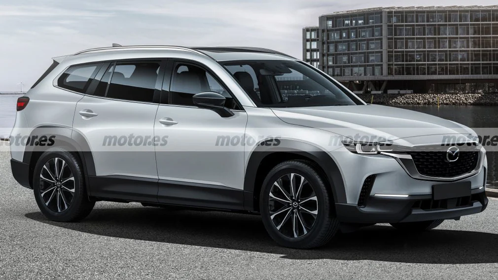 Mazda CX-80 получит фирменную решетку радиатора с широкой хромированной полосой по канту, которая визуально соединена с узкими светодиодными фарами. Бампер выглядит несколько агрессивно. Черный пластиковый обвес и стильные выштамповки добавляют модели атлетичности. Крышки боковых зеркал выполнены в темном цвете. На крыше виден небольшой «плавник».