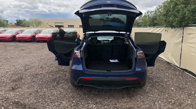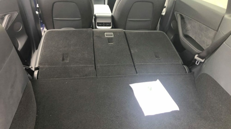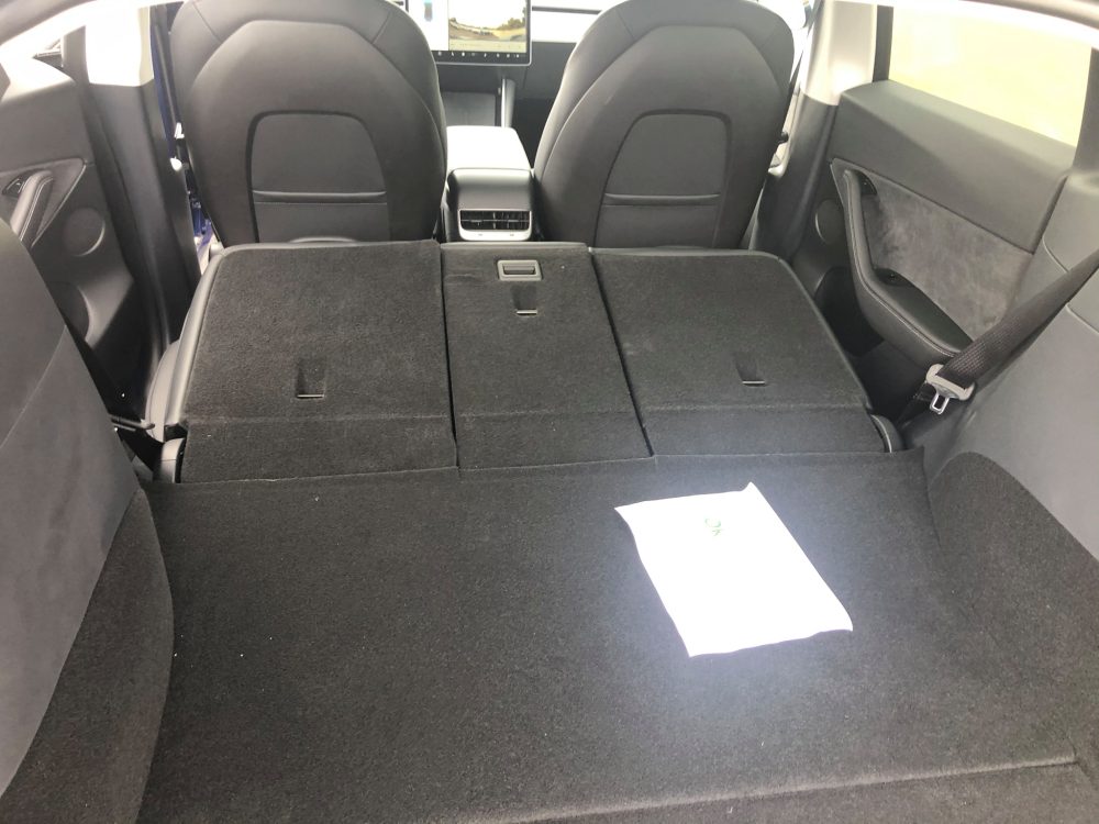 Model Y оснащена большой крышкой багажника, а не маленькой дверкой, что было, чуть ли ни главной проблемой в Model 3. Также автомобиль обладает довольно просторным багажником, который отлично видно на фото с разложенными сиденьями. В полу здесь появилась новая ниша, в которой довольно удобно размещать личные вещи, чтобы они не болтались по всему отделению.