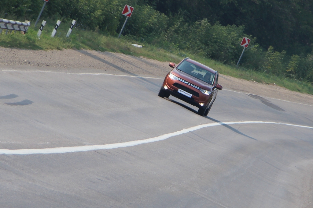 Никто не подходил к Outlander с меркой спортивной управляемости, однако умение новой машины поворачивать оказалось ниже ожидаемого порога. При крутизне маневра более шестидесяти градусов она в первой фазе поворота спокойно держится за траекторию, но, при достижении апекса, практически отказывается подчиняться рулю, демонстрируя ярко выраженную недостаточную поворачиваемость, и резко распрямляет траекторию. При этом, как говорилось выше, Mitsubishi Outlander не пугает водителя резким креном, то есть не предупреждает его об излишке скорости. Затем срабатывает ESP, и Outlander фактически «повисает», лишившись тяги. В нашем случае на распрямленной траектории оказался грузовик, уворачиваться от которого пришлось с отчаянным усердием. Конечно, можно сказать, что водитель переборщил со скоростью в маневре, но Outlander значительно лучше приспособлен для прямолинейного движения, чем для езды по серпантинам.
