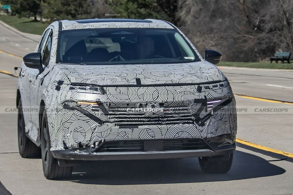 Место прежней решетки V-Motion заняла новая с горизонтальными ламелями. Передняя оптика с вертикальными секциями напоминается обновленный Kicks, а тонкая полоса светодиодов отсылает к Ariya. Широкий нижний воздухозаборник в переднем бампере перенесен из актуальной модели. На дверях — новые боковые зеркала. Лобовое стекло плавно перетекает в покатую крышу с панорамным люком.