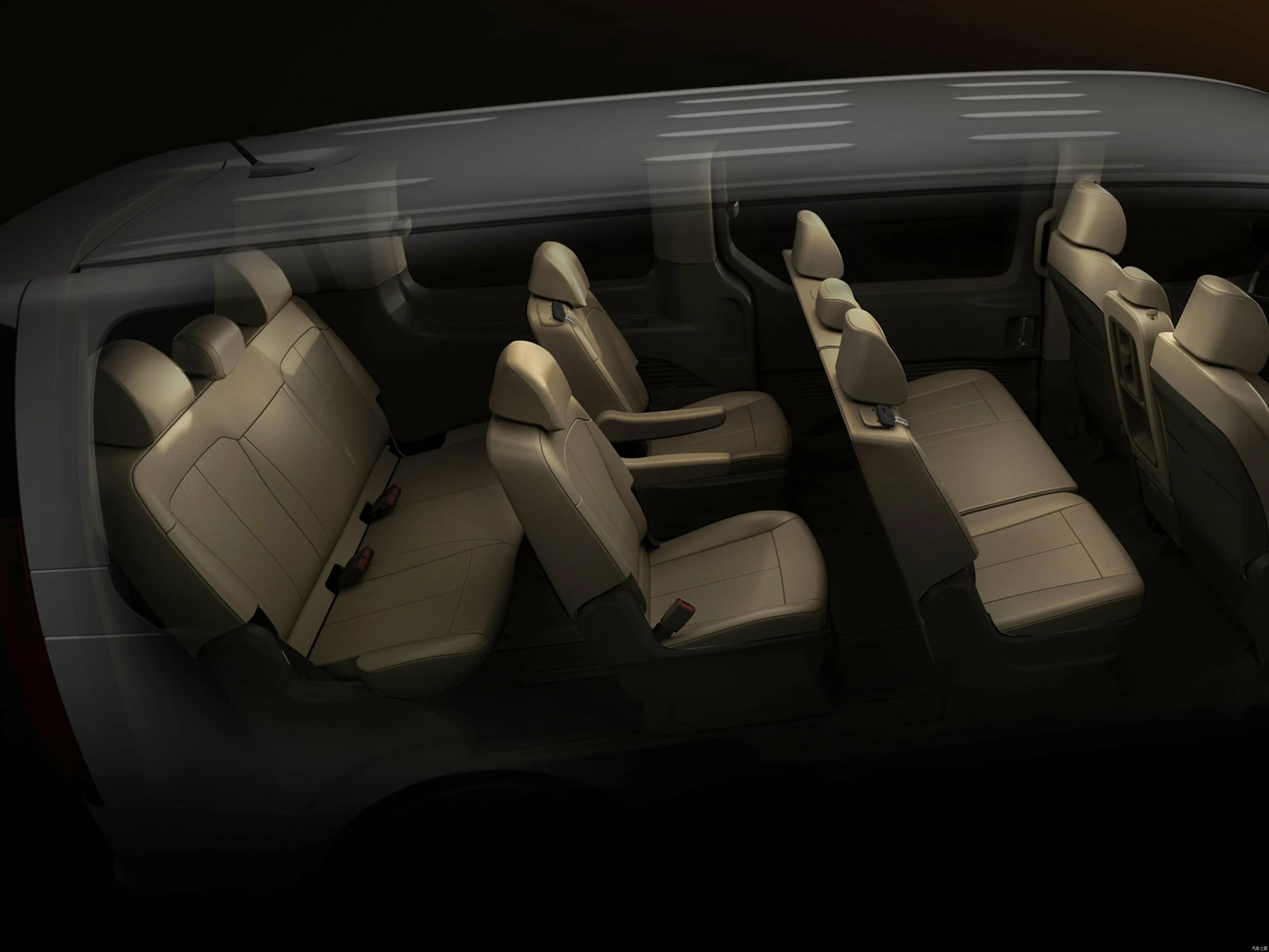 Оформление интерьера в обеих версиях минималистично. В салоне Hyundai Staria – цифровая приборная панель и 10,25-дюймовый экран мультимедиа. Сиденья могут быть расположены в нескольких комбинациях, например, в три или четыре ряда. В варианте подороже второй и третий ряды занимают отдельно стоящие капитанские кресла.