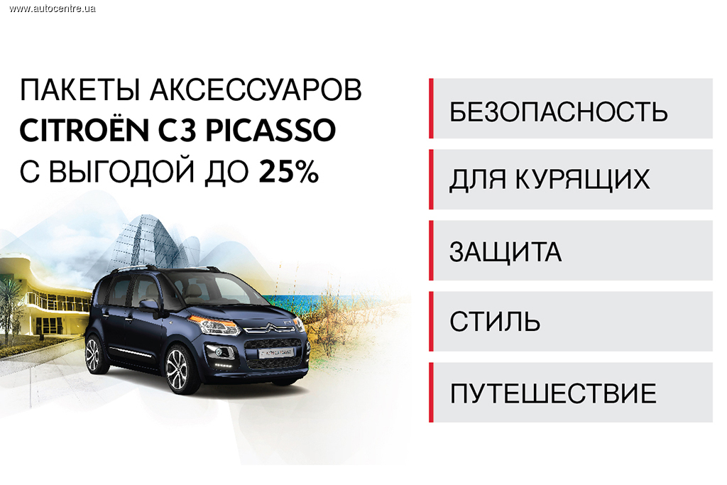 Citroen С3 Picasso – пакеты «Стиль», «Безопасность», «Защита», «Для курящих», «Путешествие»;