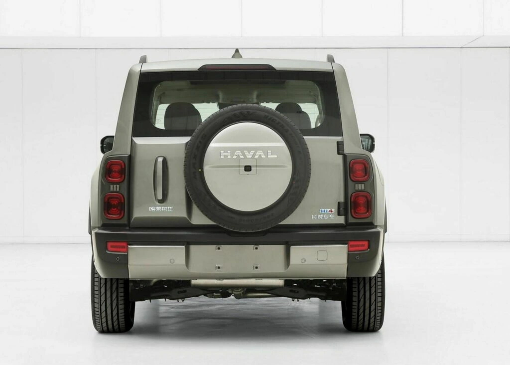 На корме — полноразмерное запасное колесо, черно-серебристый бампер и четыре квадратных задних фонаря как у Land Rover Defender.