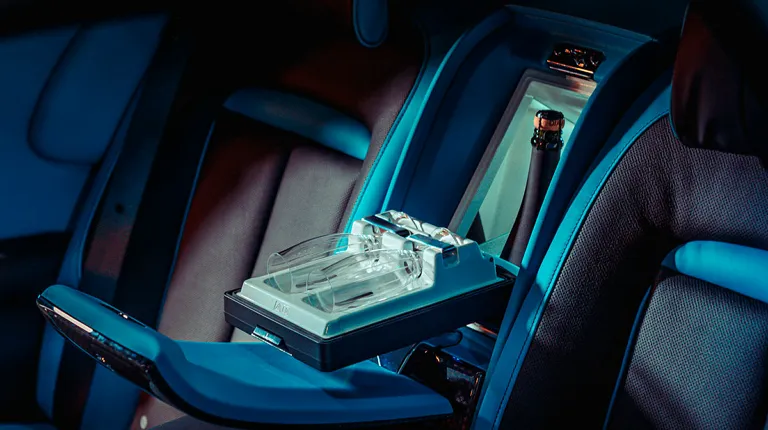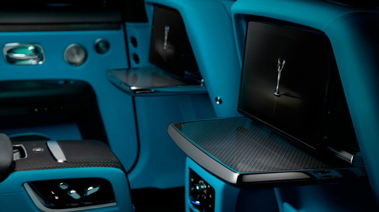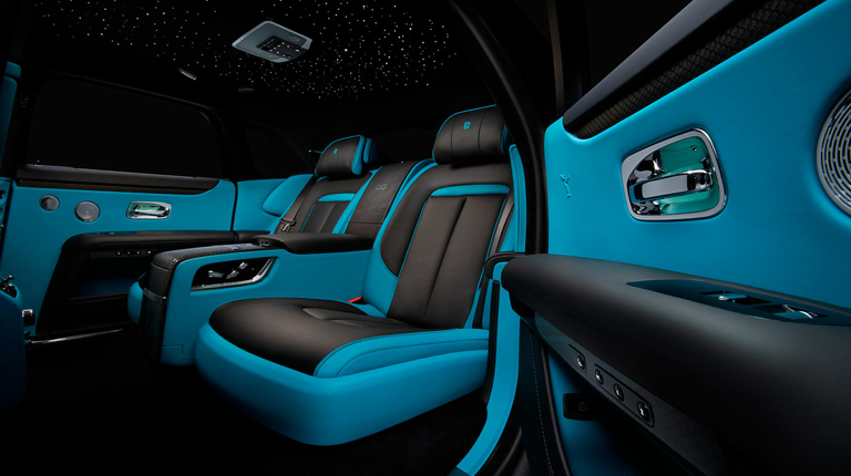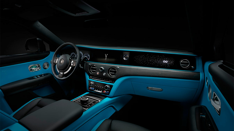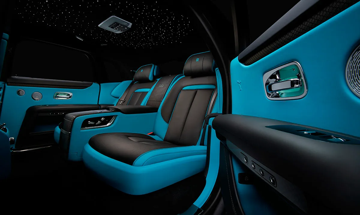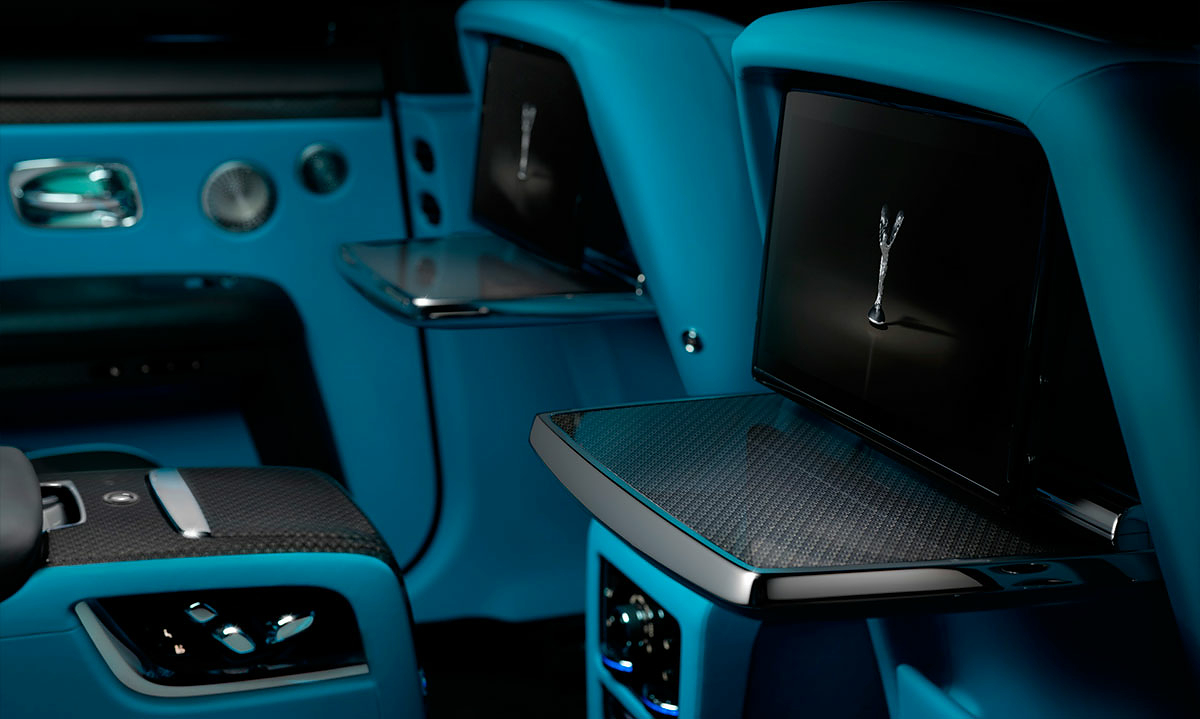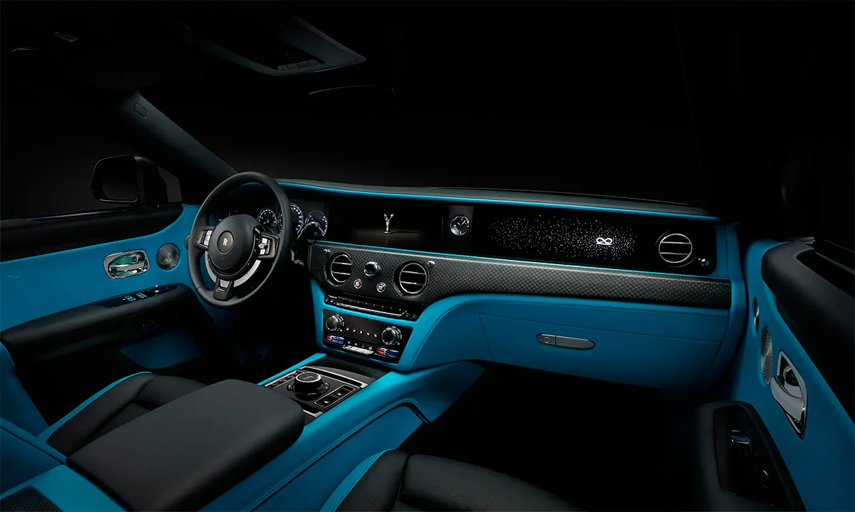 Кроме уникальной окраски кузова новый Ghost получил бирюзовый салон, декорированный натуральным деревом и карбоном. Потолок украшен фирменным «звездным небом», созданным с использованием 1500 оптоволоконных элементов.
