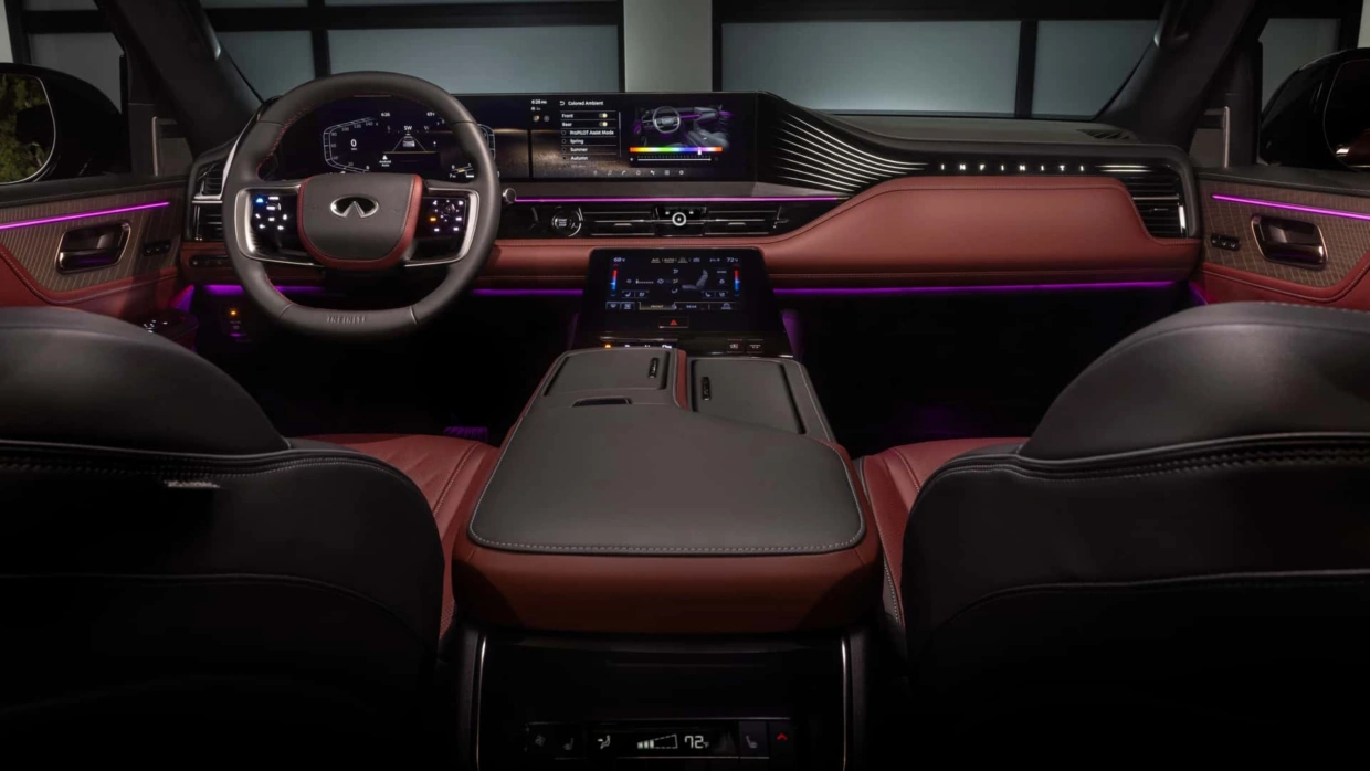 За качество звука в салоне отвечает аудиосистема Klipsch с 24 динамиками мощностью 1200 Вт. С конвейера она установлена в топовой комплектации Autograph. Для остальных это опция. Стандартно комплектации Pure, Luxe и Sensory предполагают 600-ваттную аудиосистему с 14 динамиками. Также заявлены поддержка Apple CarPlay или Android Auto и система ProPilot 1.1, которую можно за доплату обновить до версии 2.1. В этом случае управлять автомобилем можно будет «без рук». Плюс к этому Infiniti QX80 впервые получил проекционный дисплей.