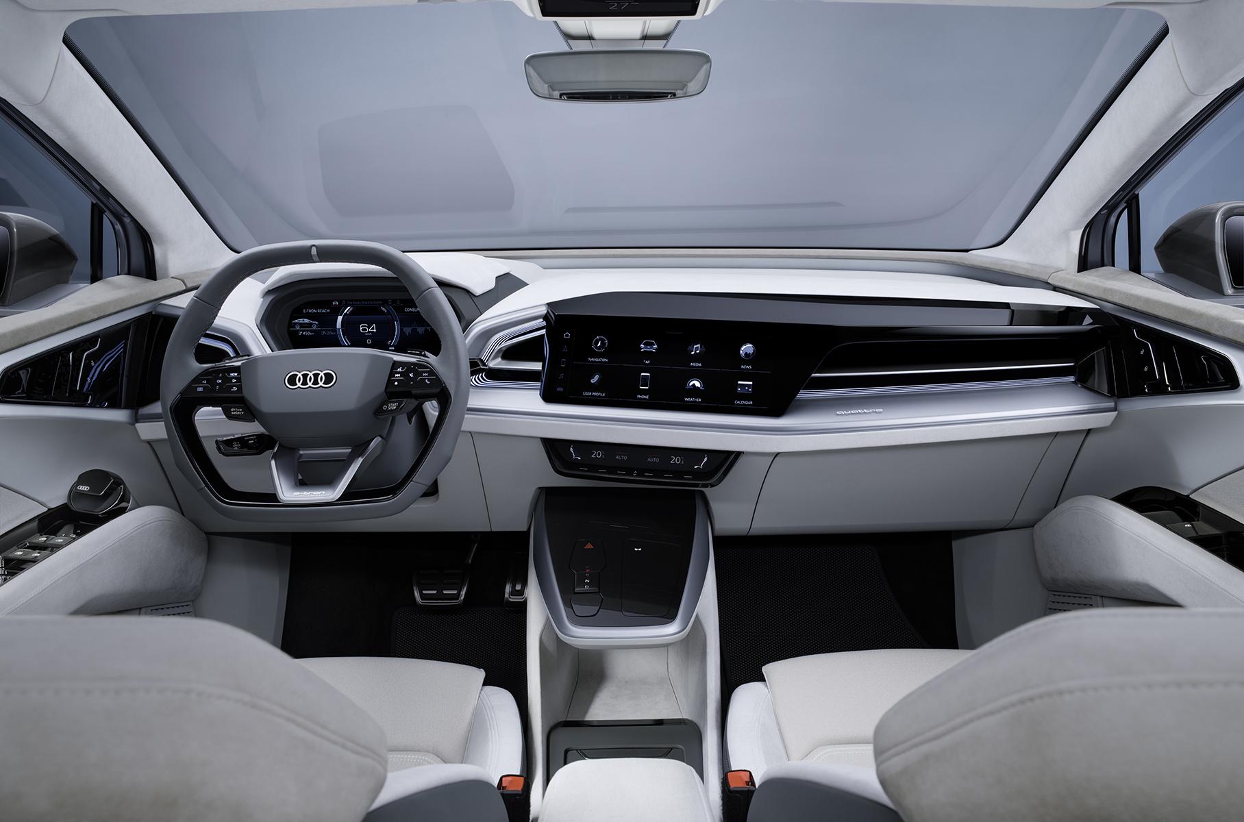 Салон Audi Q4 e-tron Sportback на первый взгляд кажется очень футуристичным, но он не должен сбивать вас с толку. Все кнопки и переключатели на месте, а крупным сенсорным дисплеем мультимедиа и цифровым щитком приборов уже никого не удивить. На конвейер компактный кроссовер Ауди отправится практически в таком же виде в 2021 году. Наверняка этот SUV будут позиционировать выше родственных моделей от Фольксваген и Шкода. Об этом в очередной раз можно судить по дизайну и дорогим отделочным материалам интерьера.