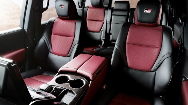 На корме установлена алюминиевая защитная пластина. Ездит внедорожник Тойота на 18-дюймовых колесах с шестью спицами, окрашенных в цвет Mud Grey. В салоне изменили отделку – теперь она сочетает черную и темно-красную кожу. На подголовниках вышита эмблема Gazoo Racing. Она также присутствует на руле и приветственной графике мультимедийной системы. Карбоновый узор на центральной консоли, дверных панелях и рулевом колесе придает автомобилю спортивный характер.