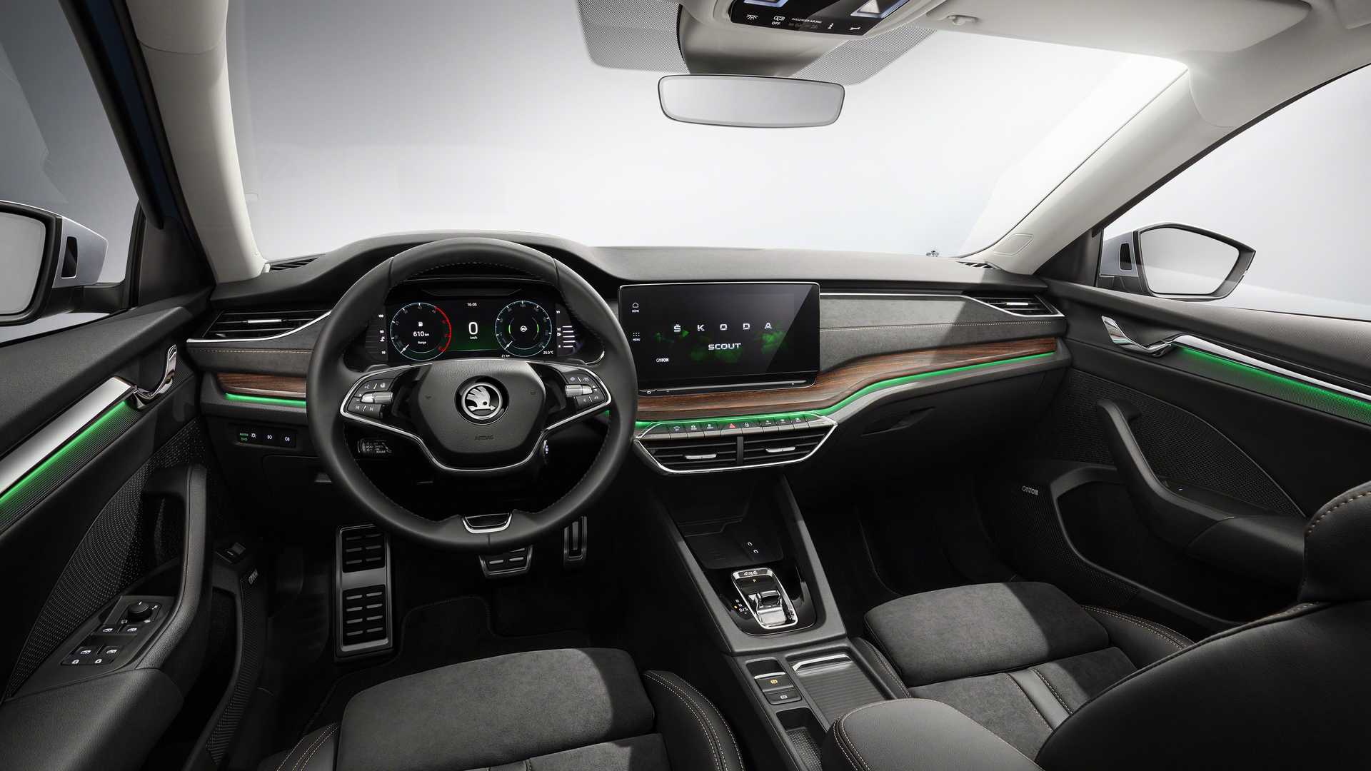 Изменения в интерьере минимальны. Вседорожная версия схожа с обычной дорожной Octavia, исключения – нюансы оформления. Материал сидений – кожа и особая дышащая ткань. На передней панели появились декоративные вставки, на педалях – металлические накладки.
