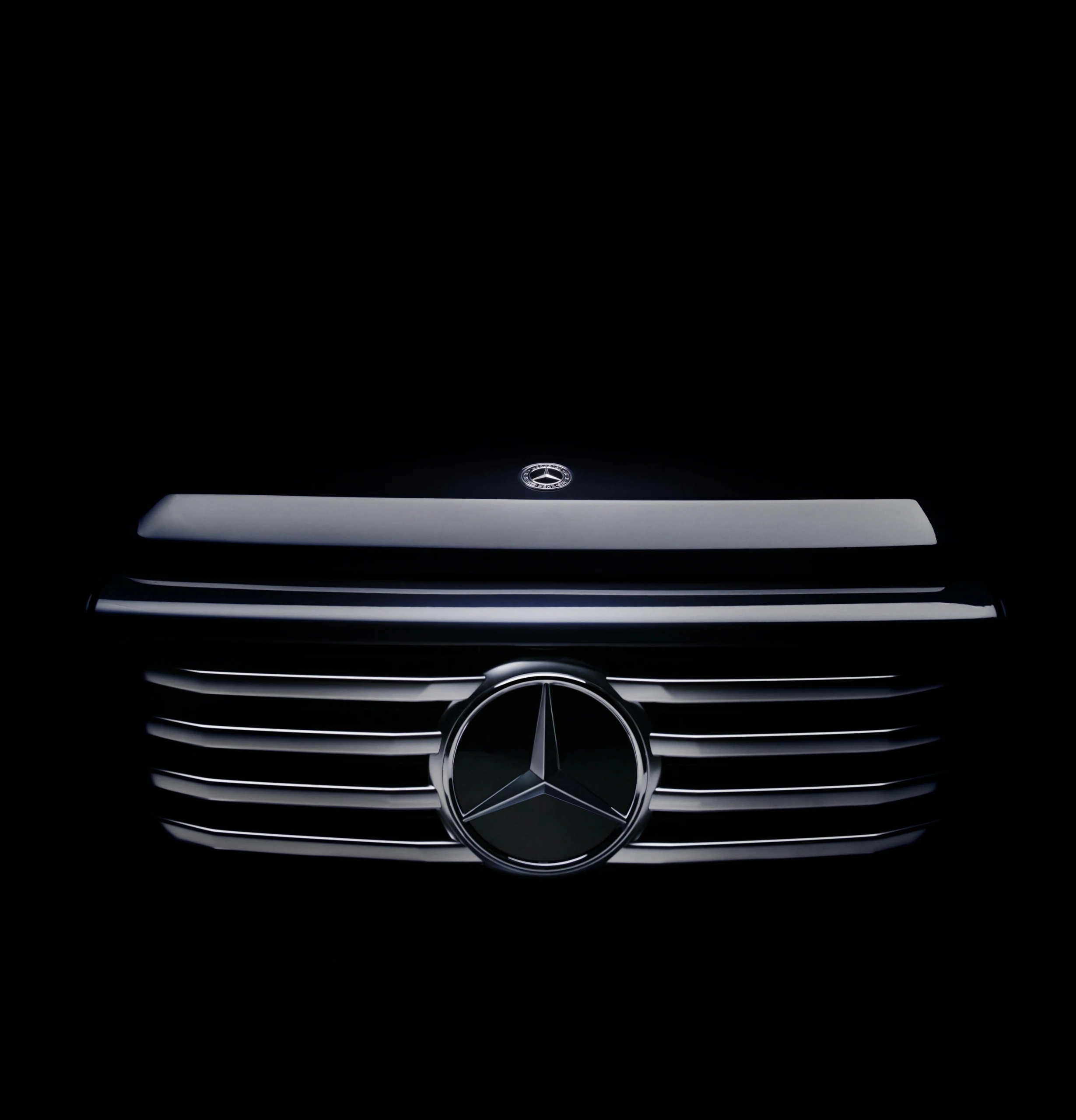 Анонс нового Mercedes-Benz G500 сопровождается единственным тизерным изображением передней части кузова. На нем видны широкая ретка радиатора с горизонтальными ламелями и массивным логотипом бренда по центру. Его миниатюрная копия видна над передним краем капота.
