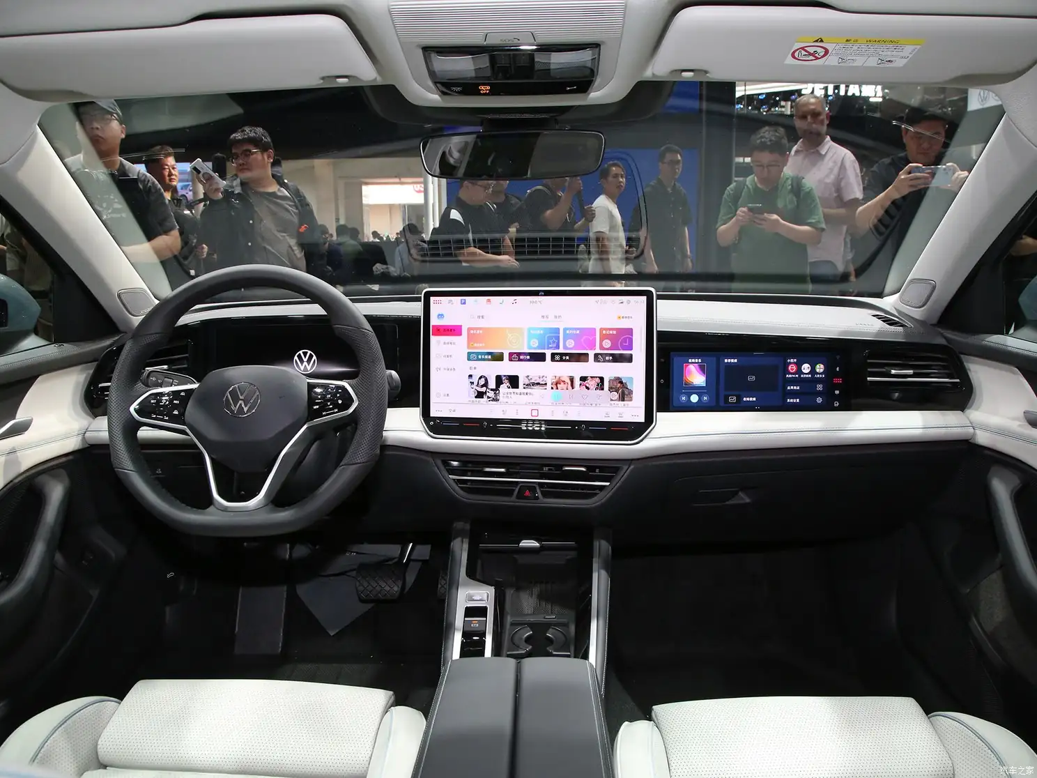 В салоне полусенсорное рулевое колесо и три экрана на передней панели. Диагональ дисплея приборной панели — 12,25 дюймов. По центру установлен 15,0-дюймовый дисплей, с пассажирской стороны — на 11,6 дюйма. Также имеется проекционный дисплей. Работает все это на чипе Qualcomm Snapdragon 8155. Система поддерживает CarPlay и CarLife. За переключение коробки передач отвечает подрулевой рычажок. Освободившееся место под центральной консолью можно использовать для хранения вещей. В переднем ряду есть два порта Type-C.
