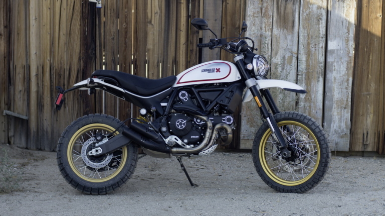 Scrambler Desert Sled комплектуется V-образным 803-кубовым двигателем, который также используется для комплектации Cafe Racer, а также Ducati Monster 797. Итальянским инженерам удалось построить спортивный эндуро. Для этого мотоцикл оснастили длинноходными подвесками с большим набором регулировок (свободный ход – 200 мм), взяли спицованные колесные диски (19″ спереди и 17″ сзади) и установили на них раллийные покрышки Pirelli Scorpion STR Rally, чем значительно повысили клиренс. Решетчатую раму укрепили в расчете на более высокие нагрузки. А фара в базе получила решетку для защиты от летящих из-под колес впереди идущих мотоциклов камней. Мотор производит 75 л. с. мощности, которых вполне достаточно и для города, и для грунтовых дорог.