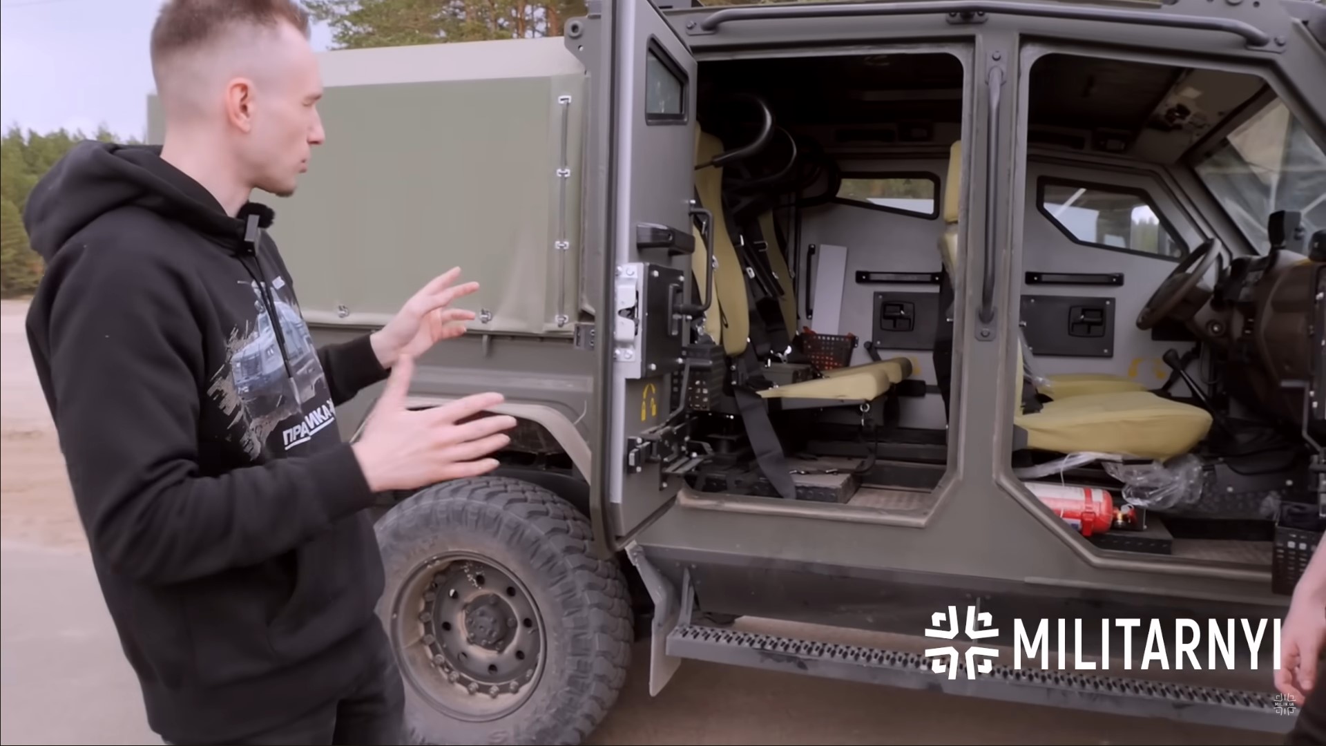 В салоне заслуживают внимание специальные сиденья, а также обивка потолка из пористой резины, защищающая голову пассажиров при прохождении неровностей. Передняя панель перешла от донора. На машине установлена инфракрасная камера, а также камера заднего вида. В качестве опции возможен и тепловизор.