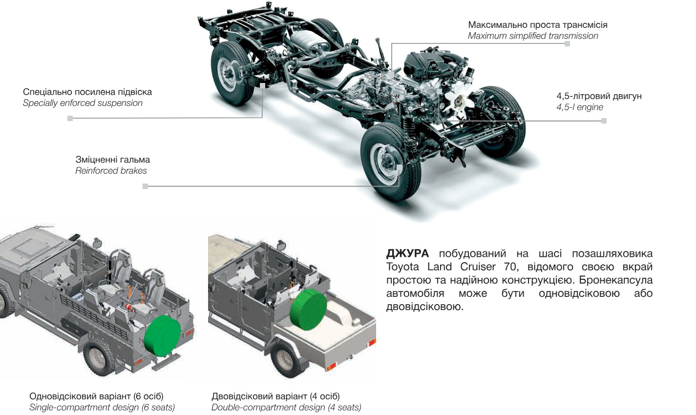 Автомобиль имеет модульную конструкцию, что позволяет создать на его базе до 12 модификаций различного назначения – от перевозки раненных до минометного расчета. В данном случае «Джура» представлен с бронекапсулой на четверых и открытым грузовым отсеком. Возможен также и полностью закрытый вариант – на 6 мест.