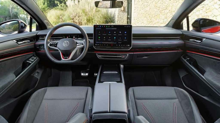 В оснащение салона вошли сиденья ergoActive с 12-позиционной регулировкой и функцией памяти, 700-ватная аудиосистема Harman Kardon, панорамный люк, проекционный дисплей дополненной реальности, голосовой помощник VW IDA с интеграцией ChatGPT, а также Apple CarPlay и Android Auto.