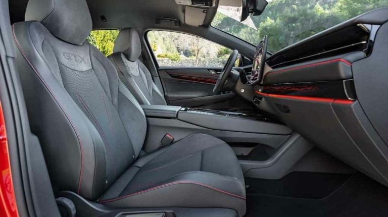 В салоне у электрокара установлены спортивные сиденья с электроприводом и вентиляцией, 12,9-дюймовый экран мультимедии, спортивное рулевое колесо. Есть голосовой помощник на базе ChatGPT. Отделка салона выполнена из кожи и алькантары с ярко-красными акцентами.