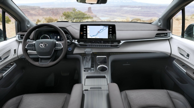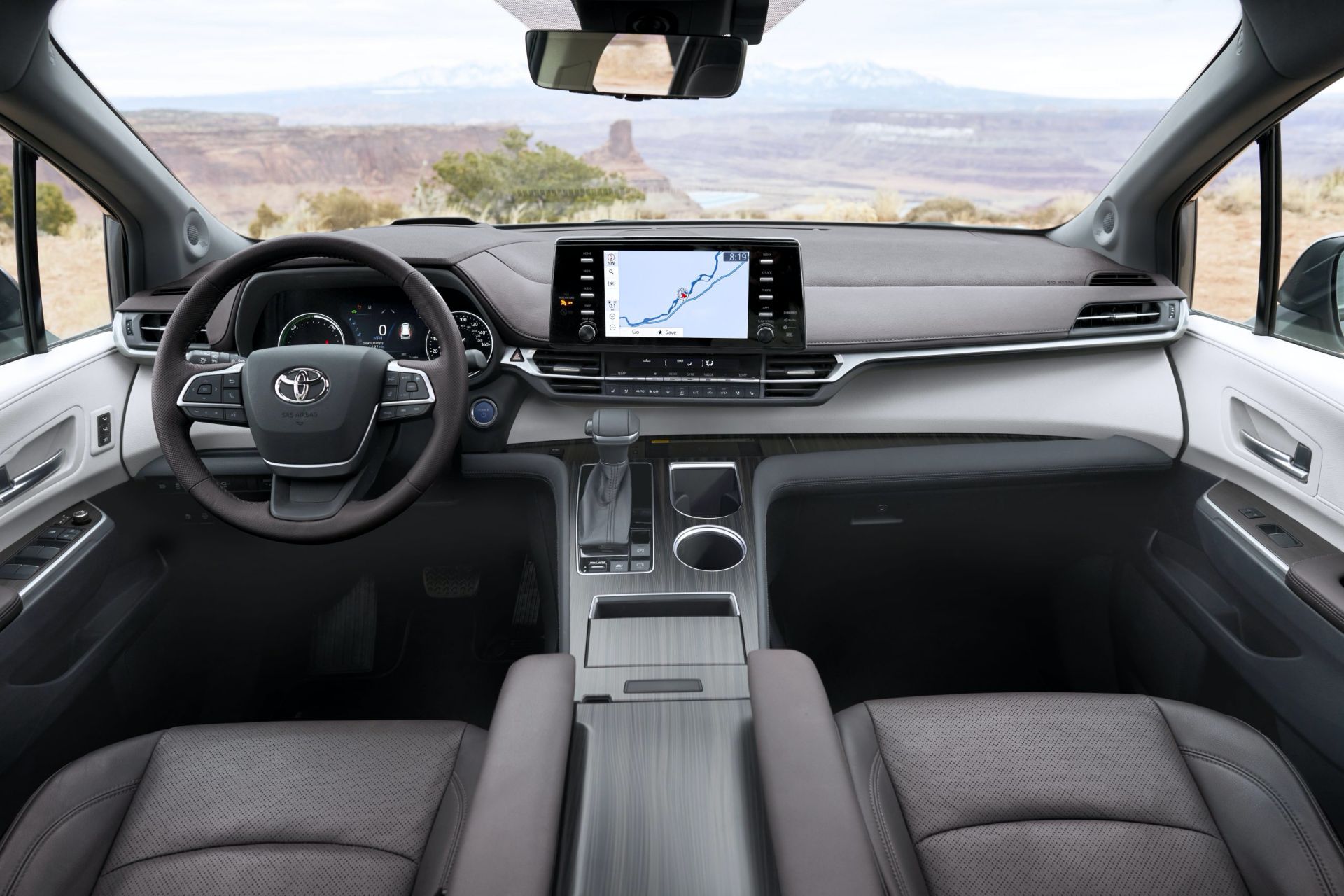 Салон обновленной Sienna также выглядит более современно и рассчитан на семь-восемь посадочных мест, в зависимости от модификации модели. В его оснащении появилась двухслойная приборная панель с 9-дюймовым «плавающий» центральным сенсорным дисплеем и мультимедийной системой с 7-дюймовым цветным экраном, инновационная консоль Bridge, четырехзонная система климат-контроля, руль с подогревом, цифровое зеркало заднего вида и аудиосистема JBL Premium Audio с 12-ю динамиками. Также в комплектацию входит бортовой пылесос и холодильник.