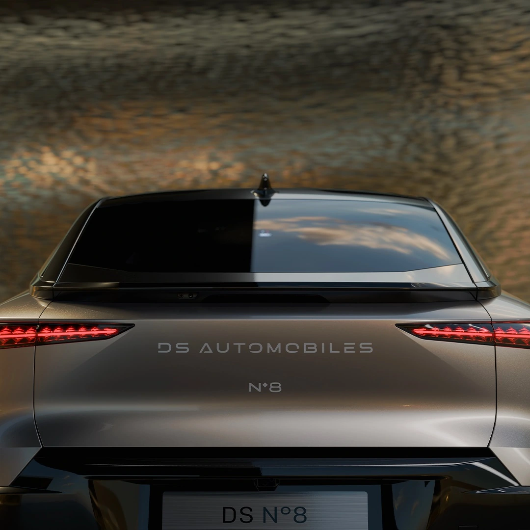 Новий DS N°8 також є першою моделлю в лінійці Бренду, що має вертикальний світловий знак позаду. Оригінальний вертикальний світловий елемент робить Новий DS N°8 миттєво пізнаваним вночі, навіть на відстані 100 метрів. А особлива тригранна форма ліхтарів LIGHT BLADE покращує аеродинамічні якості та оптимізує повітряні потоки у задній частині кузова. Нарешті, варто відзначити й сегментований візерунок всередині ліхтарів.