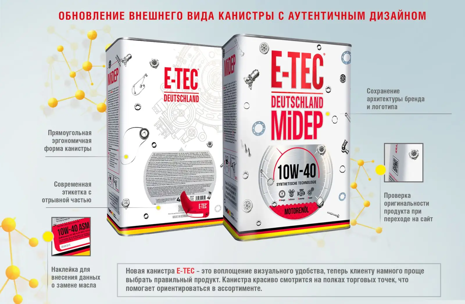Изменился дизайн 1 и 4 литровых металлических канистр моторных и трансмиссионных масел Е-ТЕС. Канистра бренда Е-ТЕС – воплощенная идея комфортного и понятного выбора продукции. На новых канистрах дополнительным элементом стала этикетка, выполненная в виде спидометра с информацией о продукции. Предусмотрена отрывная этикетка-трансформер, которая является подкапотным информационным стикером при замене масла. Нововведения призваны сделать информацию о продуктах более наглядной и облегчить автовладельцам правильный подбор масла.