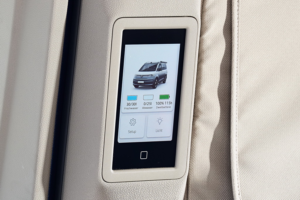 При внешнем источнике питания стационарный кондиционер работает до 30 минут. Если он работает самостоятельно, используя питание от высоковольтной батареи, кондиционер отключается через 10 минут. Стационарный кондиционер активируется через инфо-развлекательную систему или с помощью приложения для смартфона. Кемперы California можно дополнительно заказать со стационарной системой кондиционирования, которая обеспечивает непрерывную работу функции отопления. В этом случае система кондиционирования воздуха с подогревом воздуха может также управляться через блок управления кемпера на стойке со стороны пассажира.