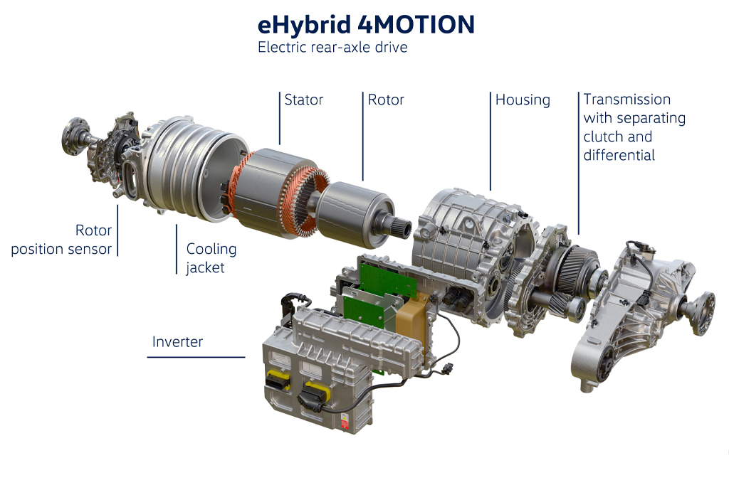 Третьим важным элементом системы является задний электродвигатель. Он развивает мощность 100 кВт/136 л.с. и максимальный крутящий момент 250 Нм. Эта мощь передается на заднюю ось через одноступенчатую коробку передач. В зависимости от ситуации привод задней оси может быть включен или выключен с помощью кулачковой муфты. Спереди и сзади установлены синхронные электродвигатели с постоянным возбуждением. Суммарно 1.5 TSI evo2 и два электромотора развивают крутящий момент 350 Нм, а максимальная мощность доступна сразу после старта.