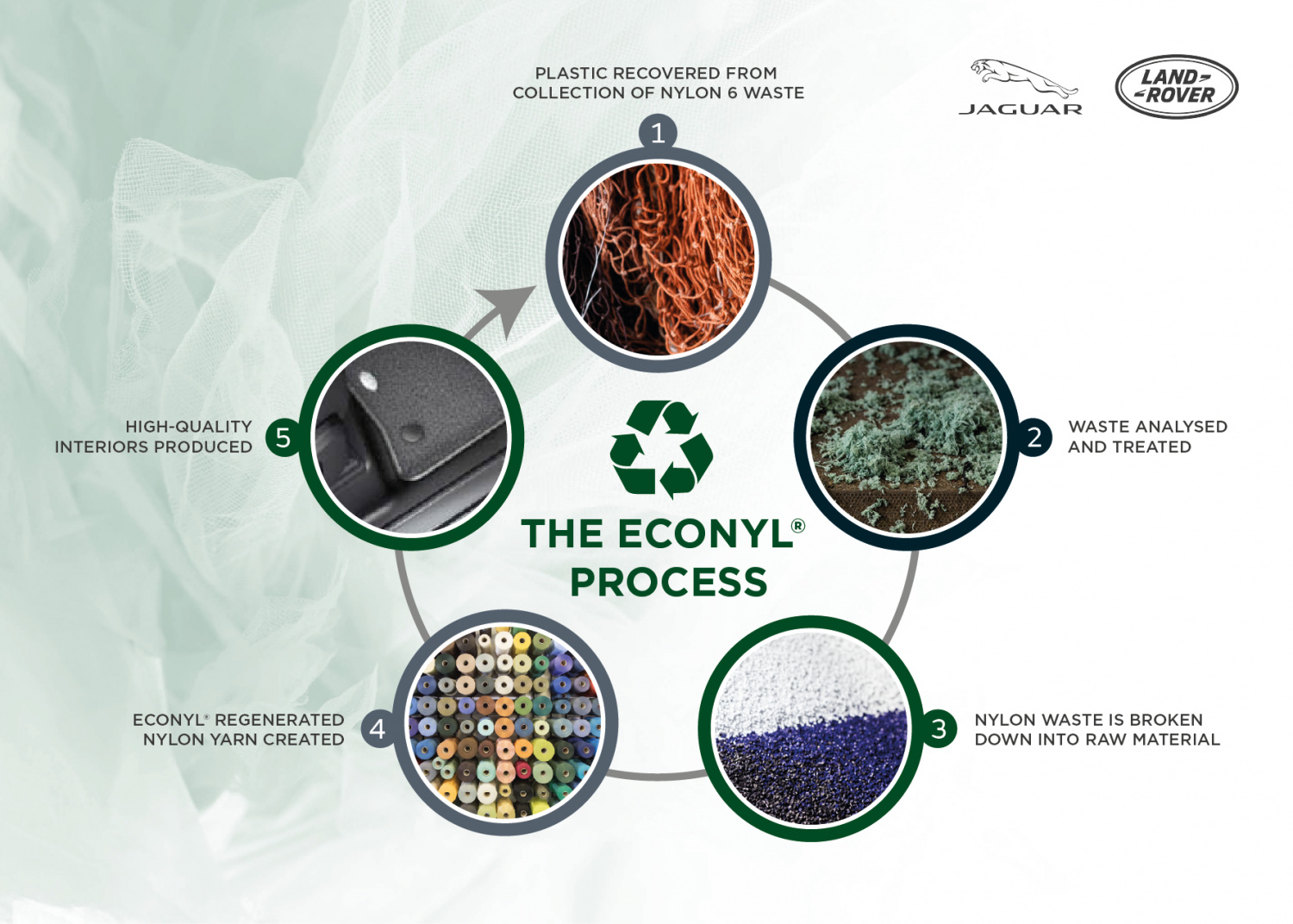 Jaguar Land Rover (JLR) заявил об использовании в автомобилях следующего поколения переработанных пластиков. Речь идет о материале под названием Econyl. Это нейлон, который производится из промышленных пластиков, обрезков тканей различных производителей одежды и рыболовных сетей, выловленных в океане.