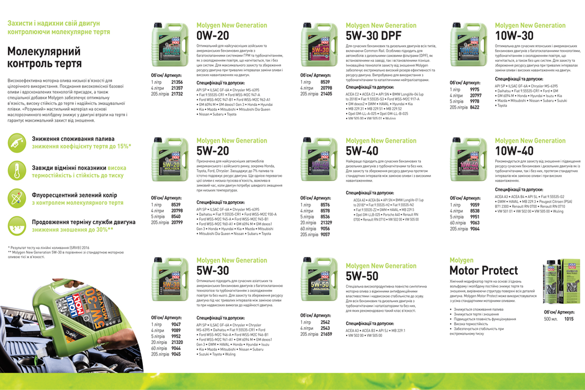 Основний цільовий сегмент Liqui Moly – сучасні авто з бензиновими та дизельними двигунами, обладнані турбонадувом, безпосереднім впорскуванням палива (GDI, TDI), каталітичними нейтралізаторами різних типів, сажовими фільтрами DPF/FAP тощо. Всі оливи відповідають сучасним стандартам ACEA, API та ILSAC, а цілий перелік олив має схвалення найвідоміших виробників: Mercedes-Benz, BMW, Volkswagen, Audi, Porsche, Volvo, Opel та ін.