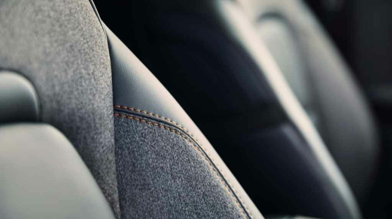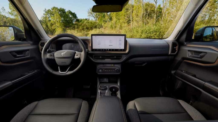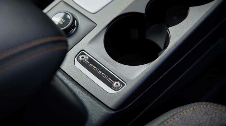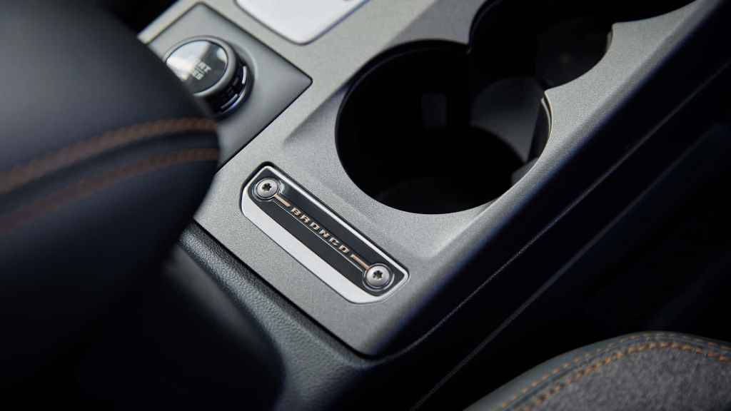 Бронзовая тема продолжается в салоне Bronco Sport. Элементы данного оттенка присутствуют на приборной панели, дефлекторах климат-контроля, дверных картах, напольных ковриках. На сиденьях и рулевом колесе присутствует строчка бронзового цвета, которая отлично сочетается с черной отделкой кабины.